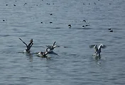 물을 튀기면서 달리다가 물 위로 사뿐히 날아오릅니다.