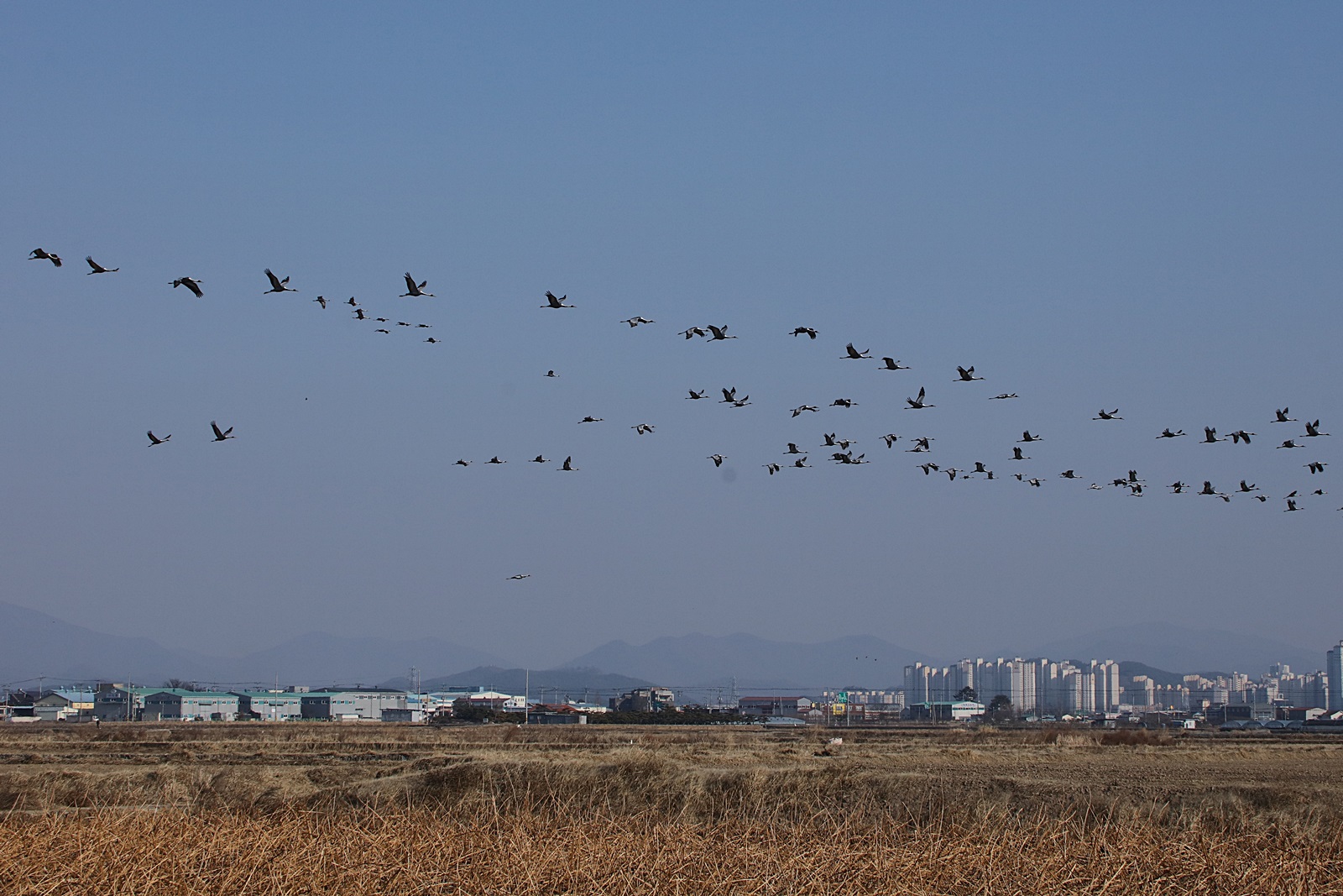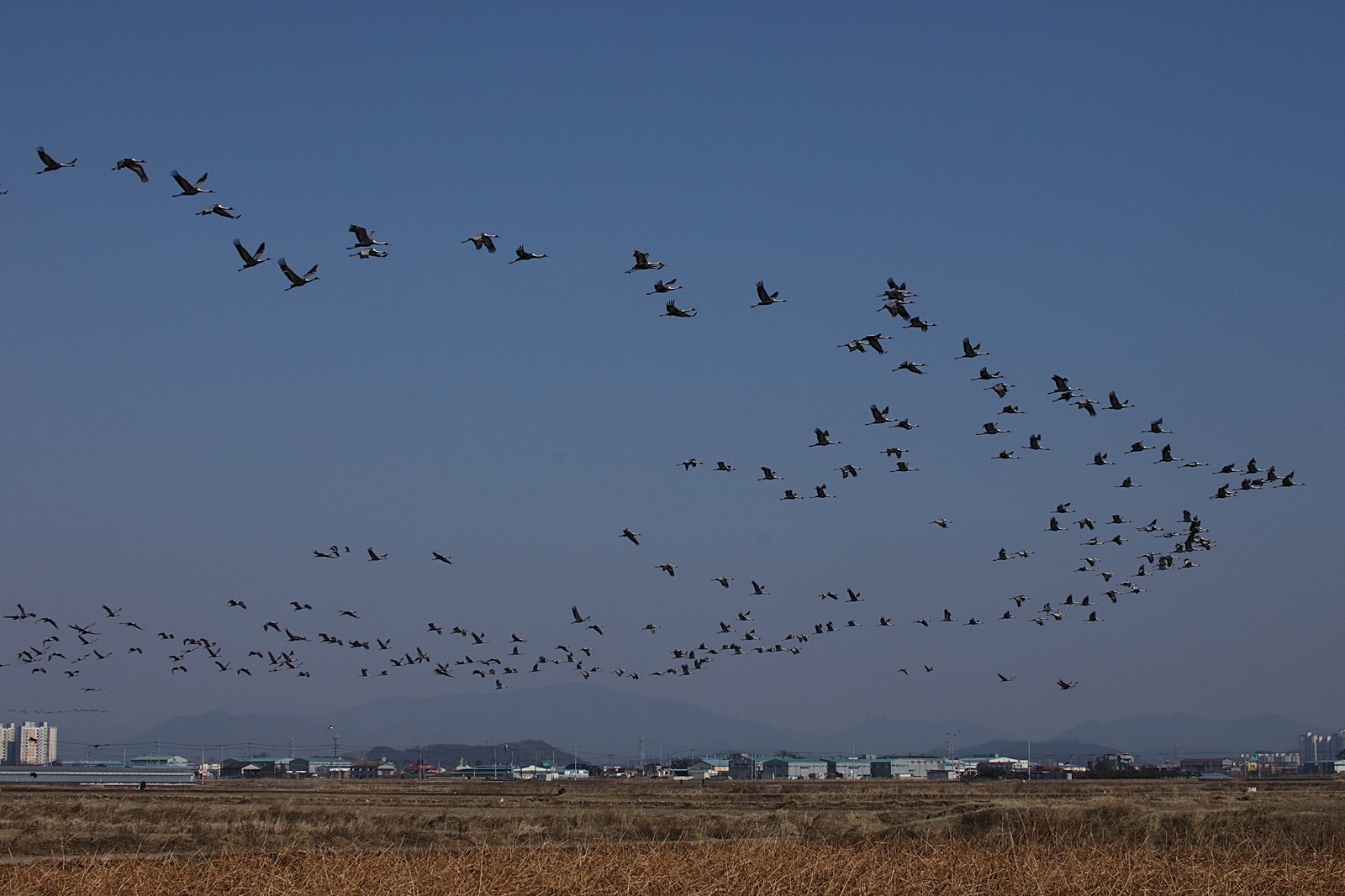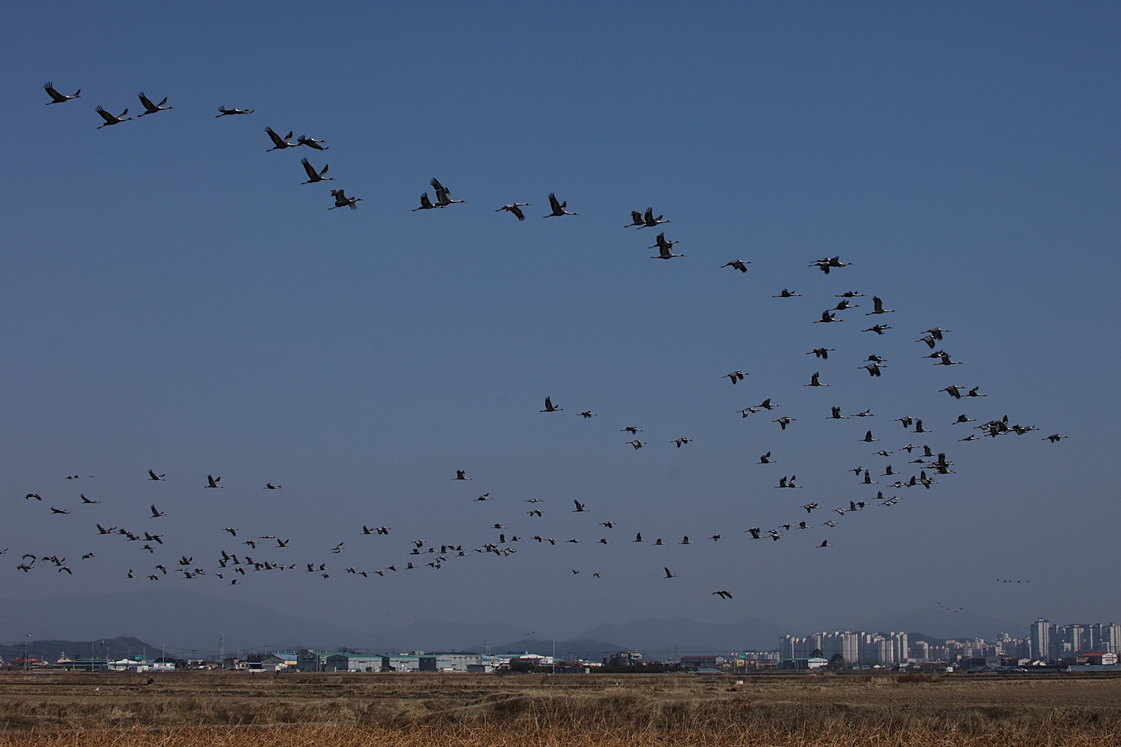 무리를 지어 주남 들판 위의 하늘을 날고 있었습니다.