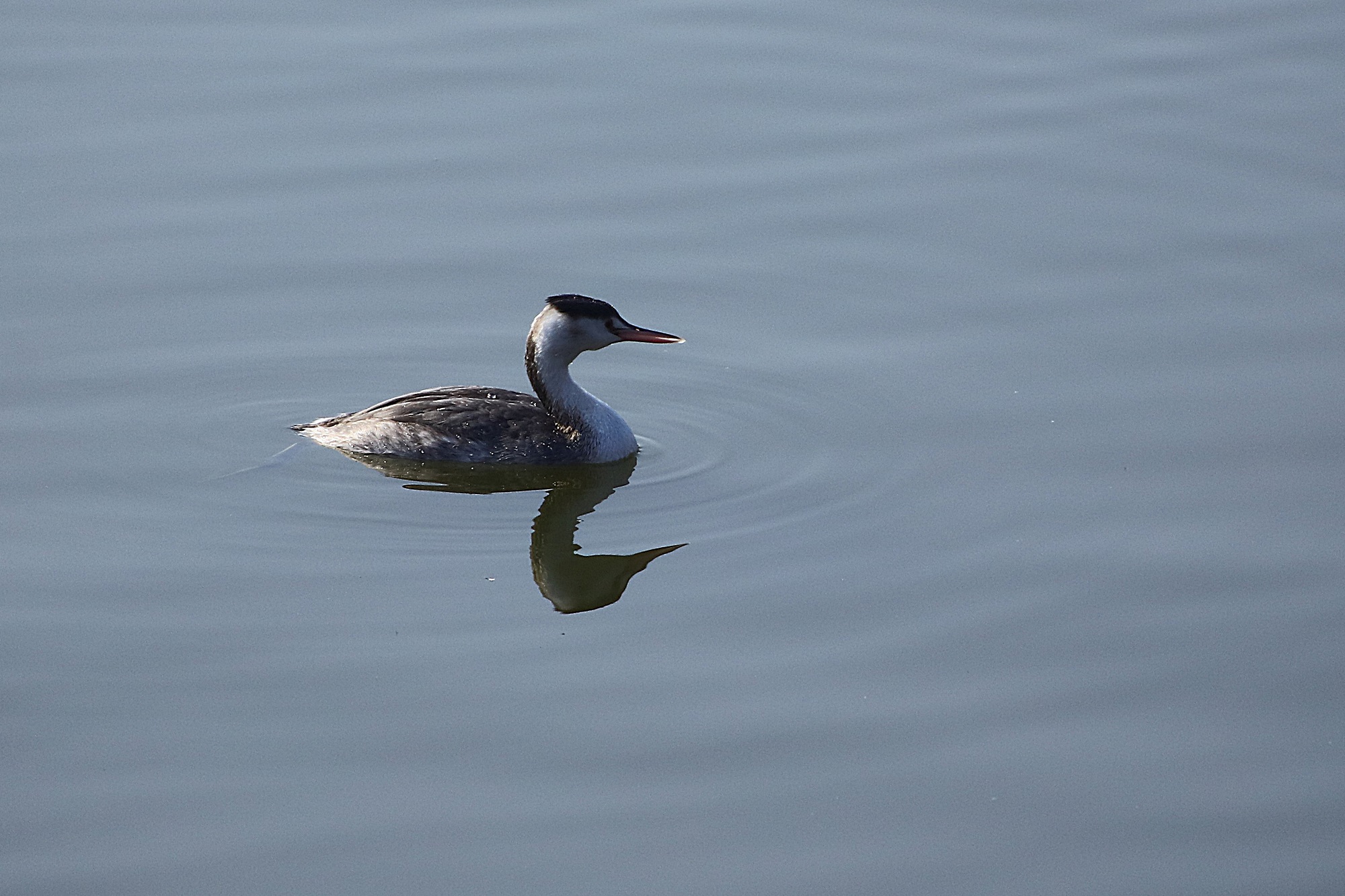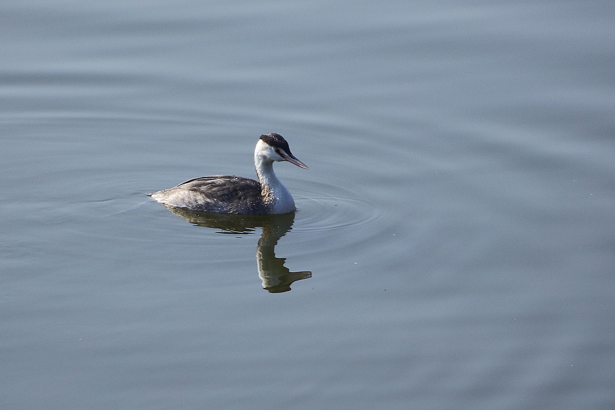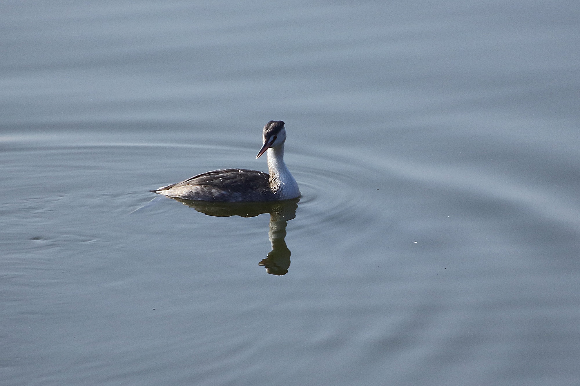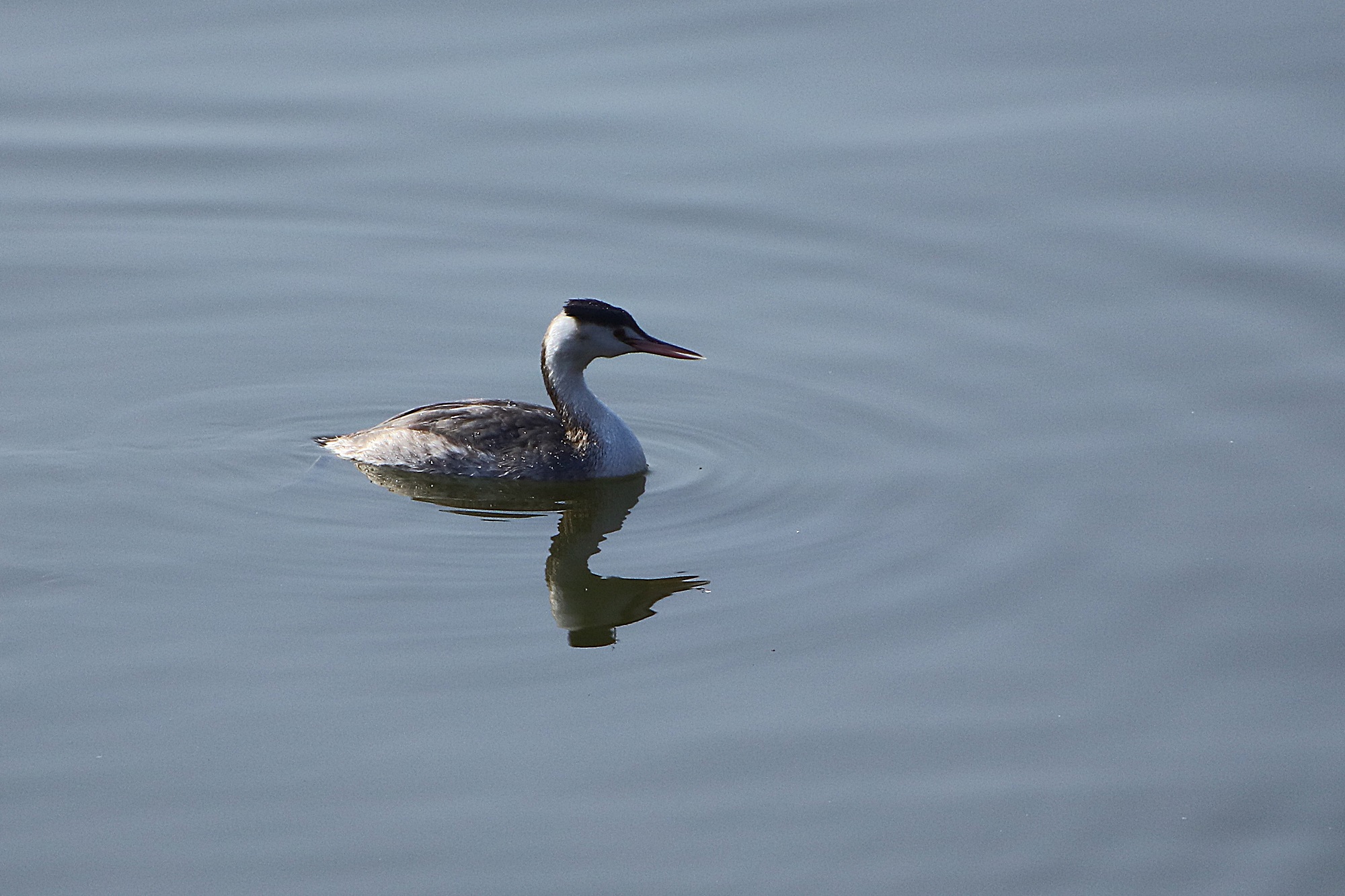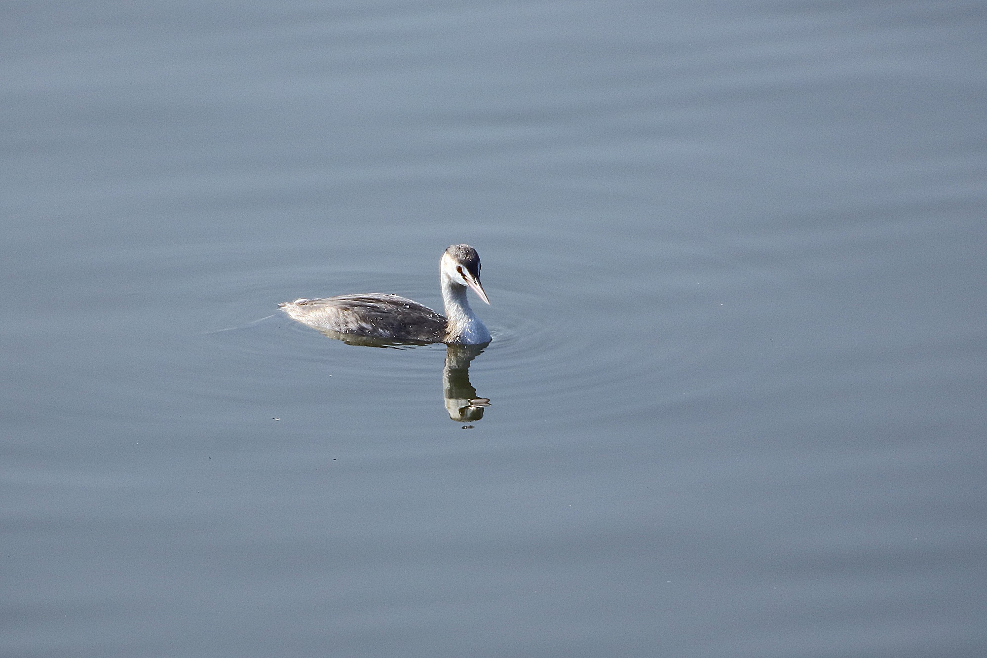 주남지에 뿔논병아리가 물에서 놀고 있습니다.