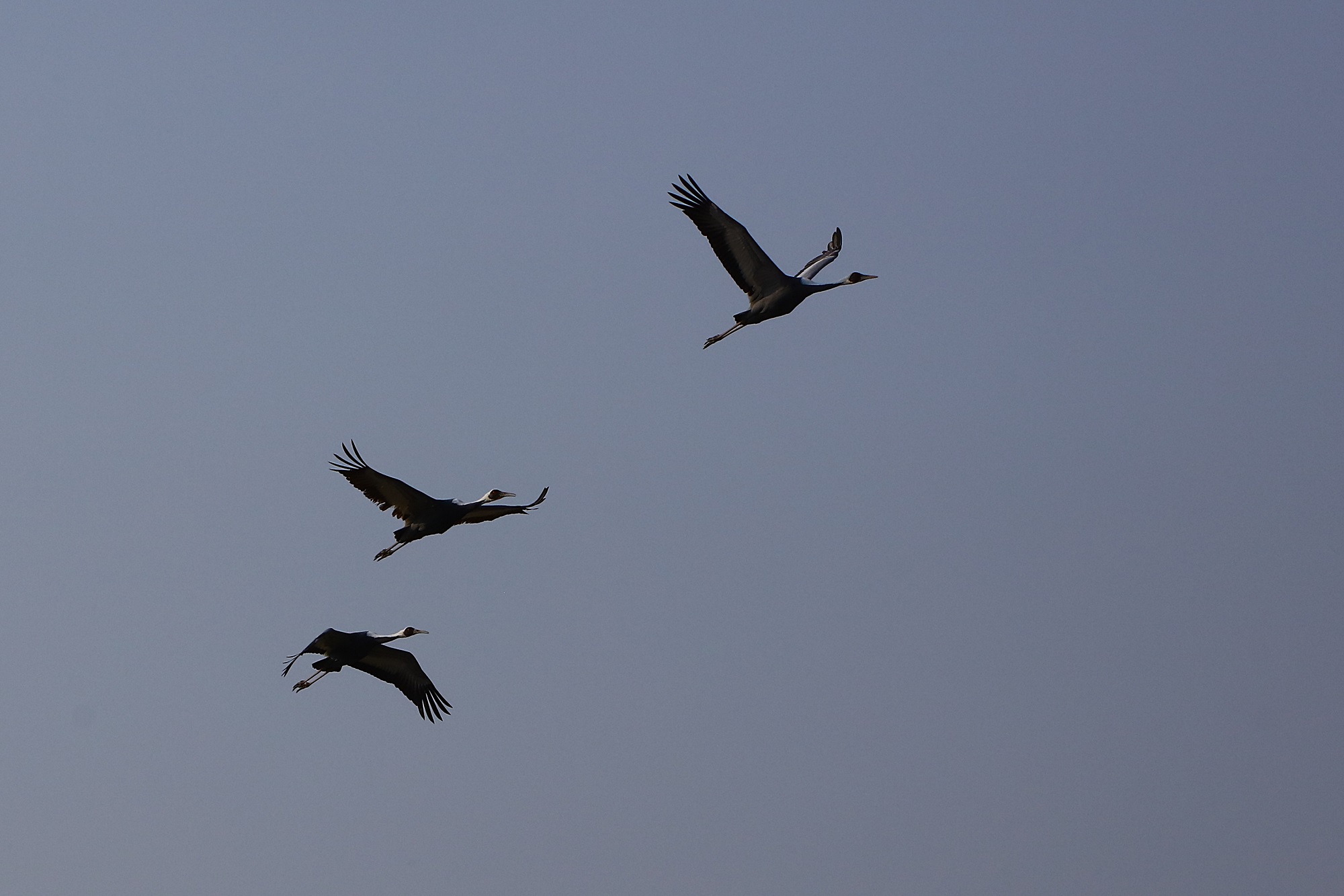 창원 주남지 들판에 재두루미 세 마리가 정답게 날고 있습니다.