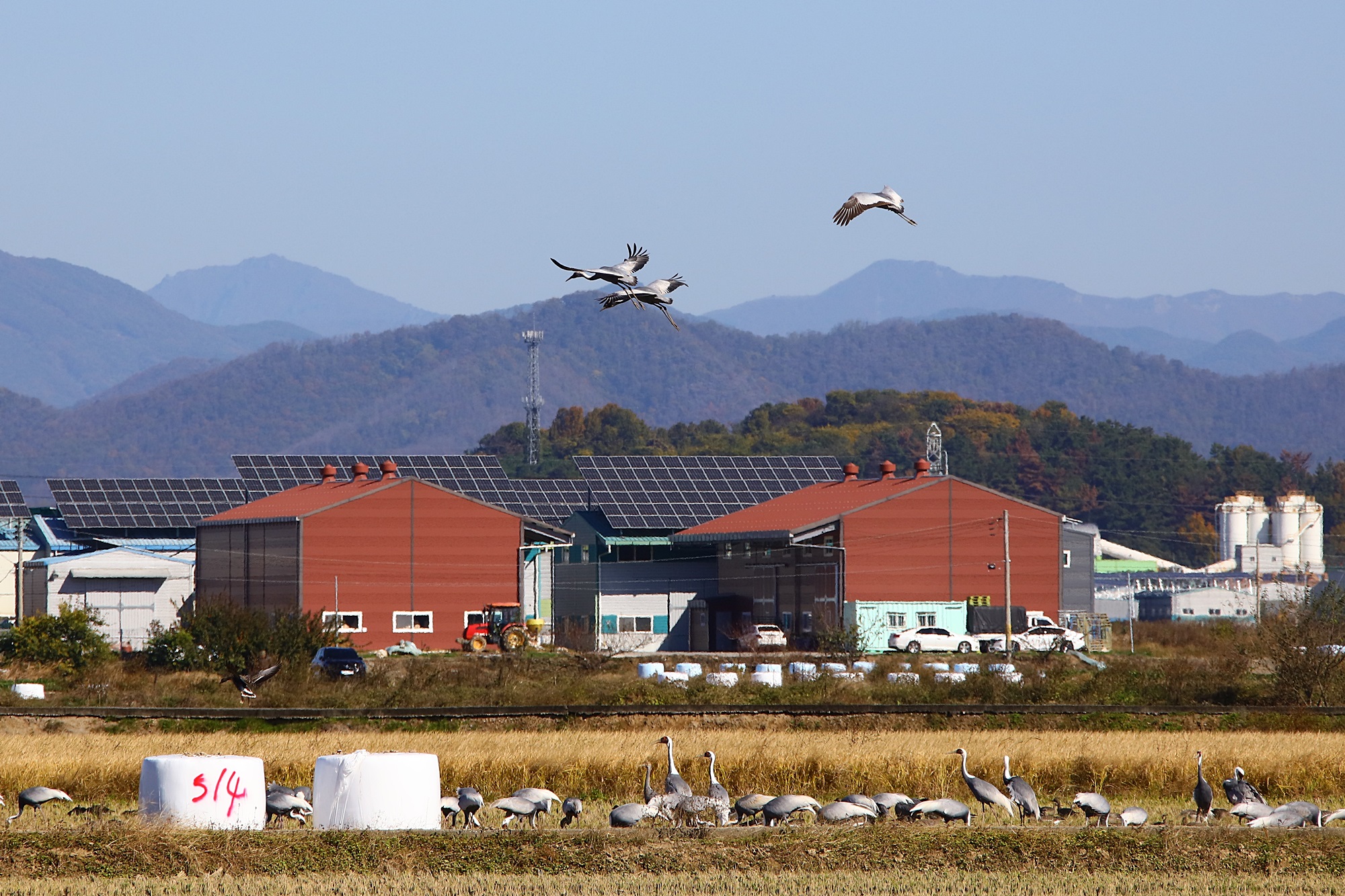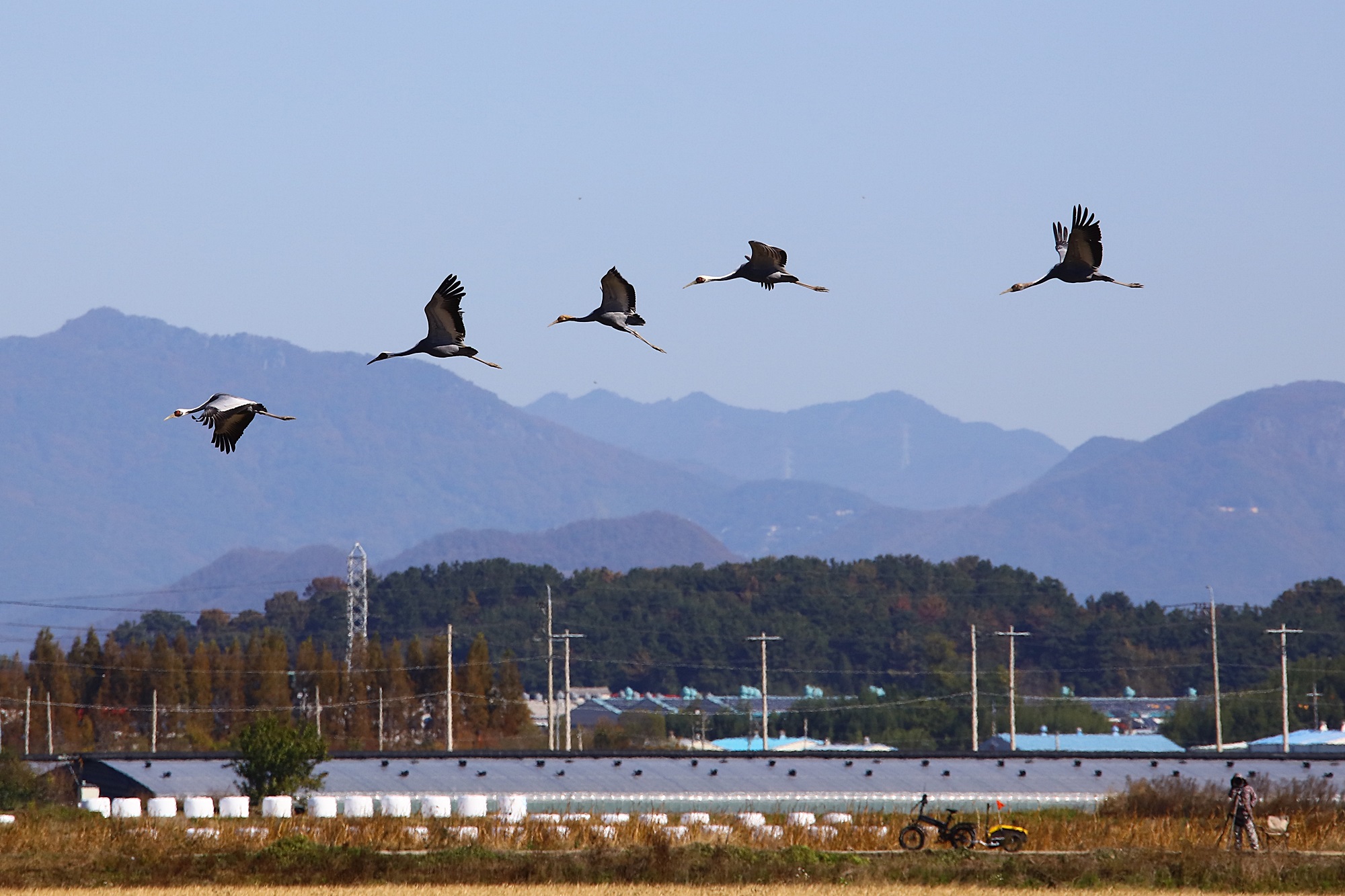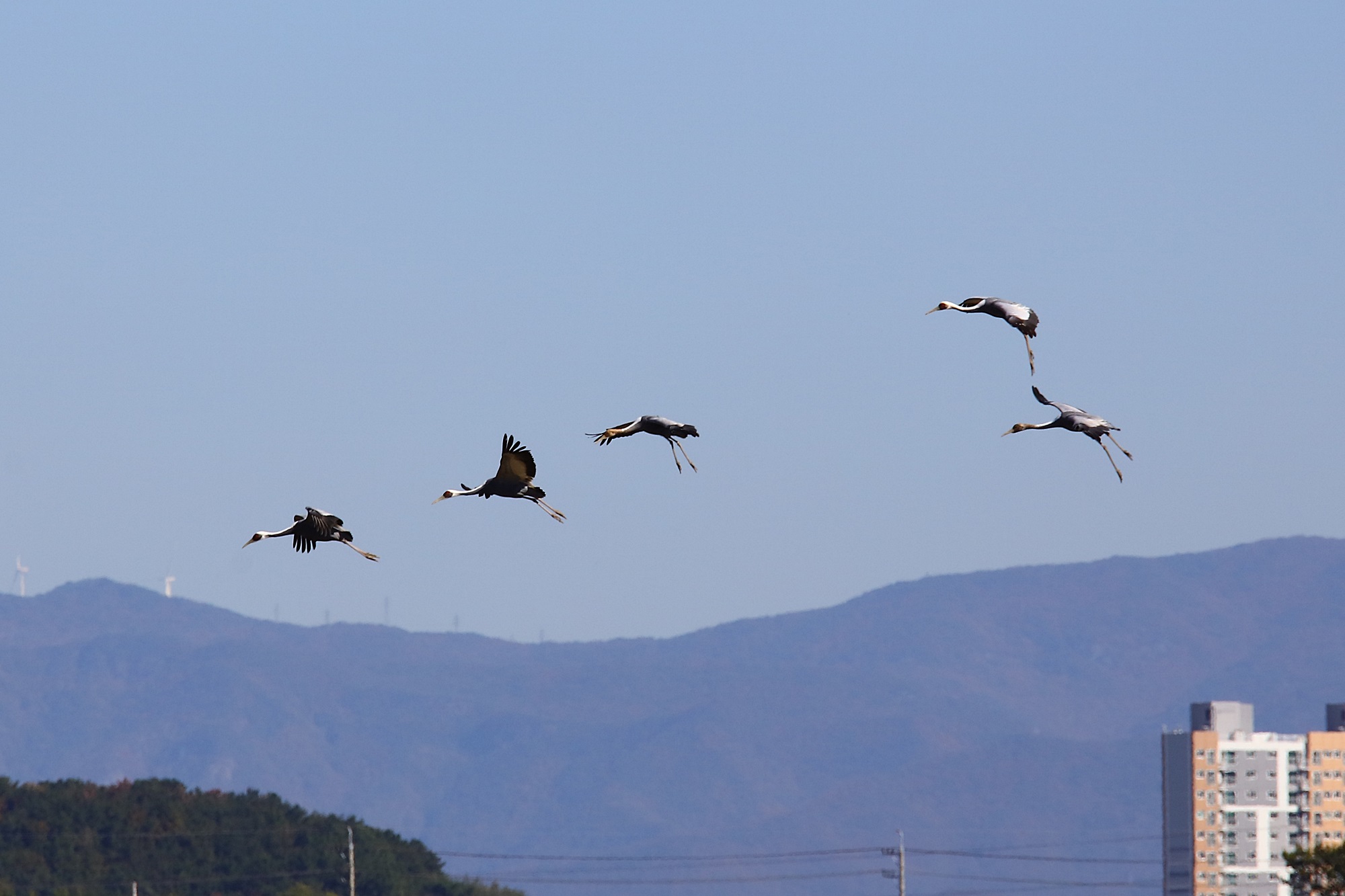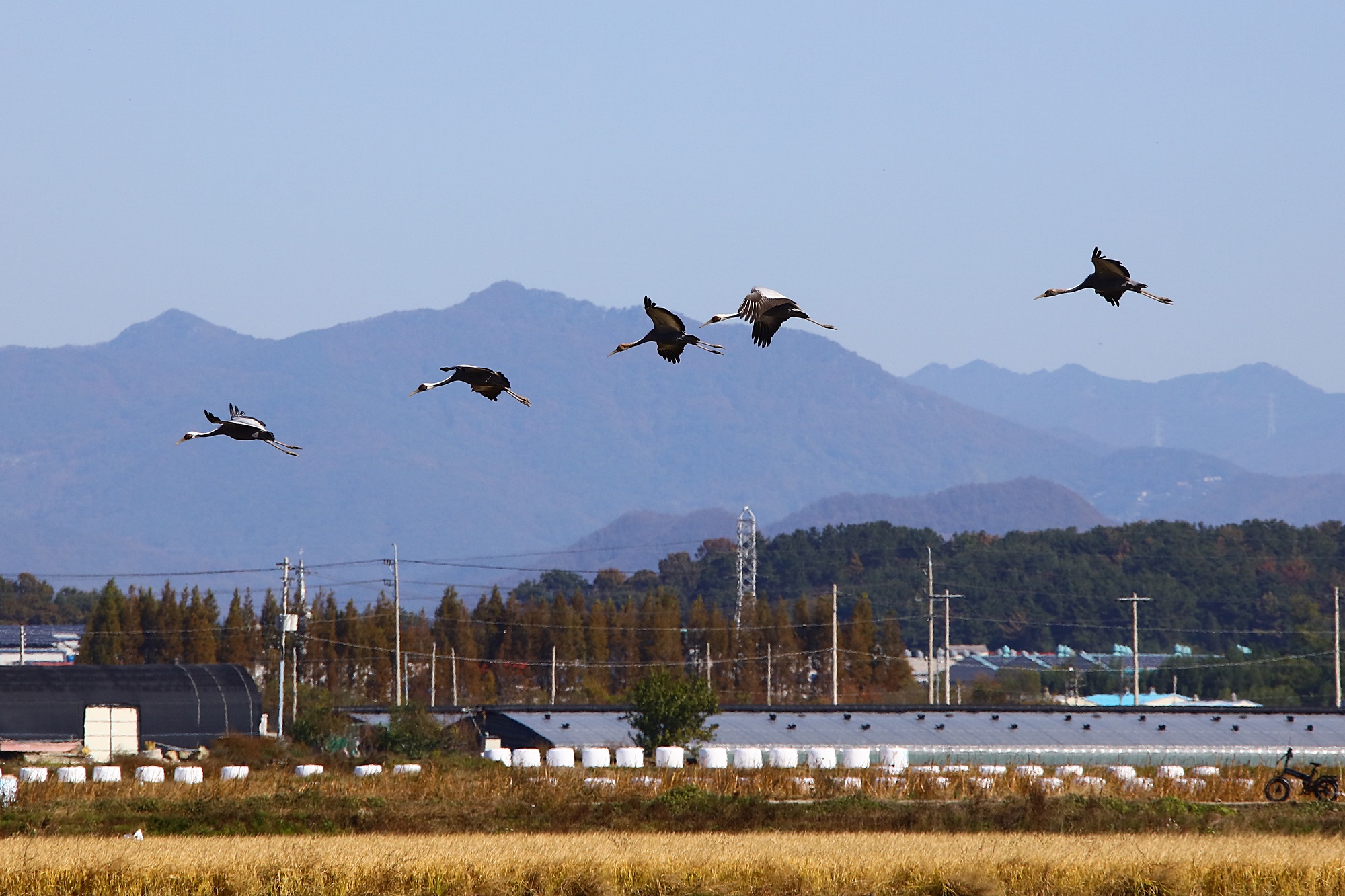 경남 창원시 주남들판의 하늘에 재두루미가 날고 있습니다.