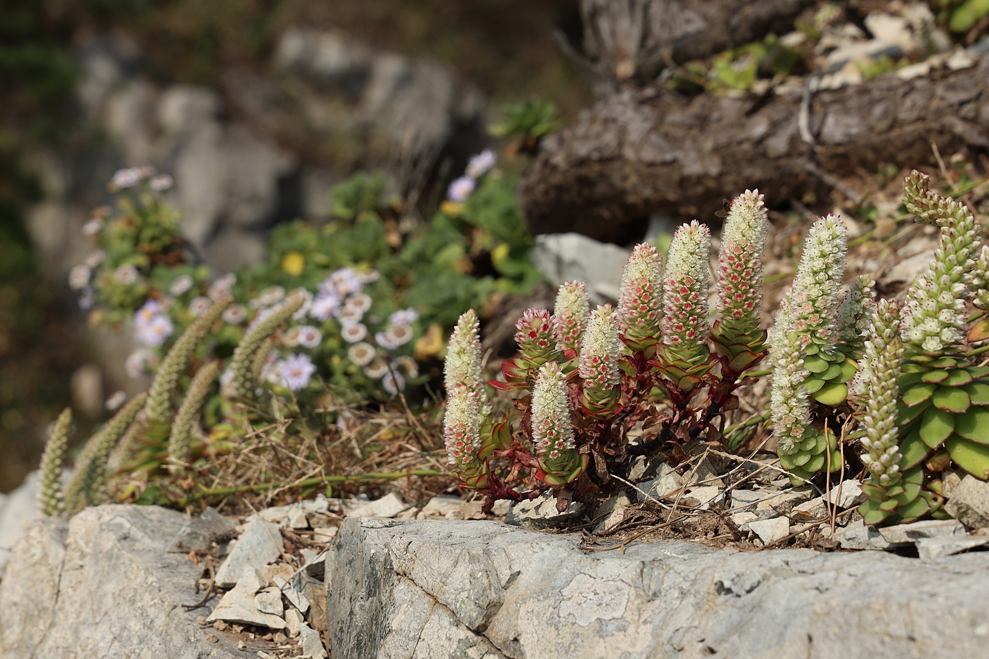 해설 : 울릉도와 제주도에 분포하는 연화바위솔에 비해서 잎은 녹색이며,