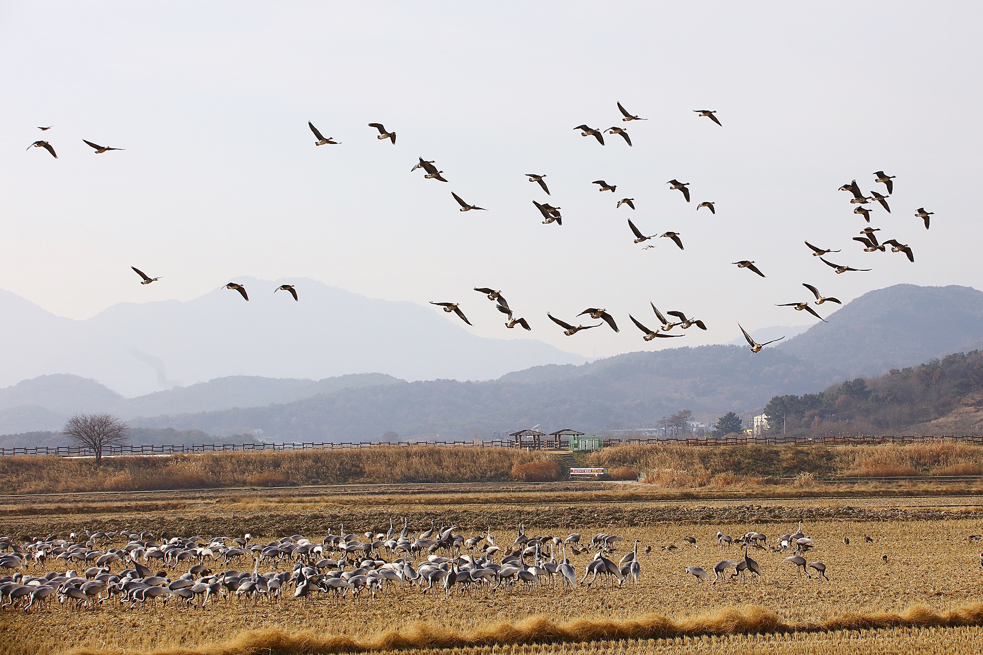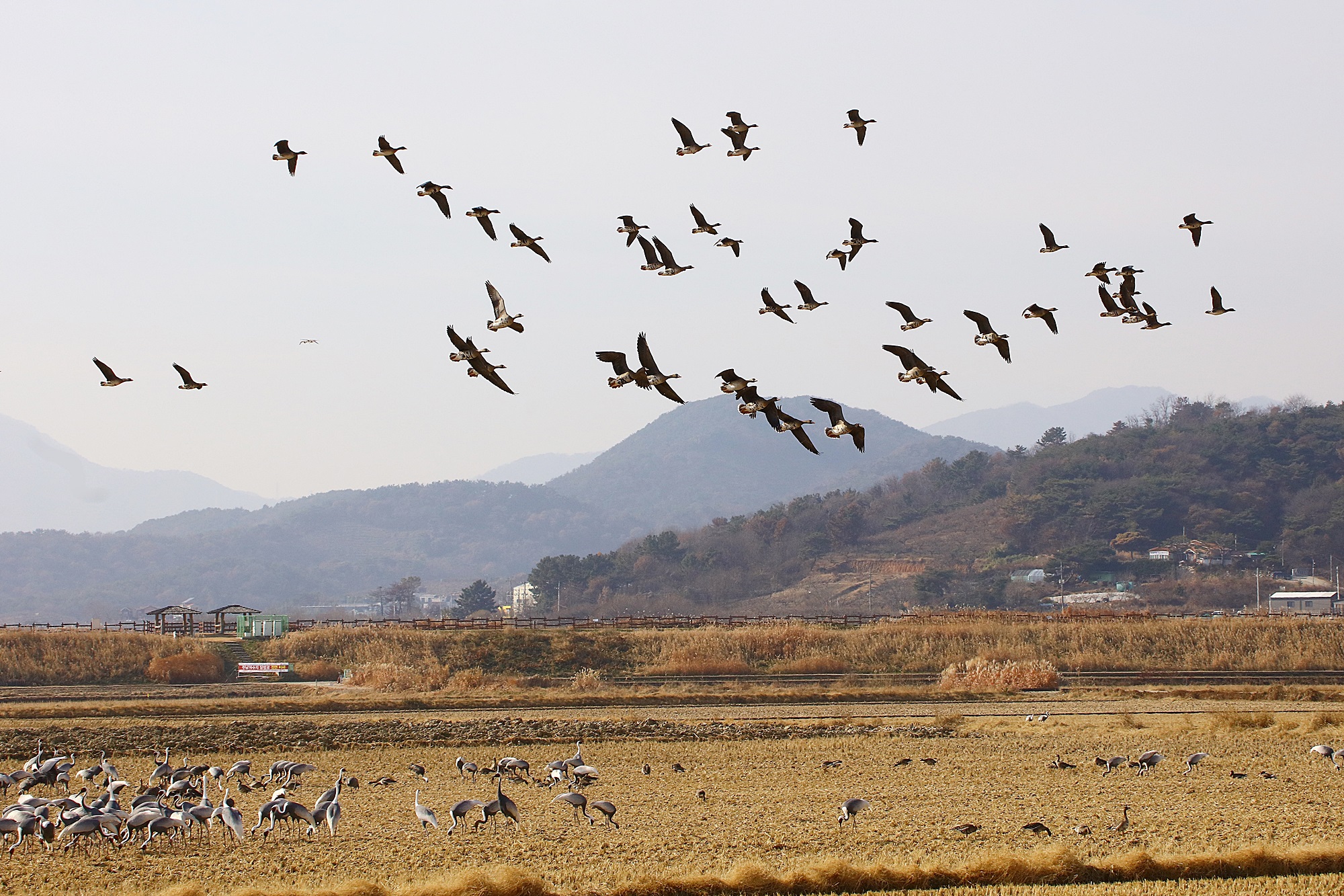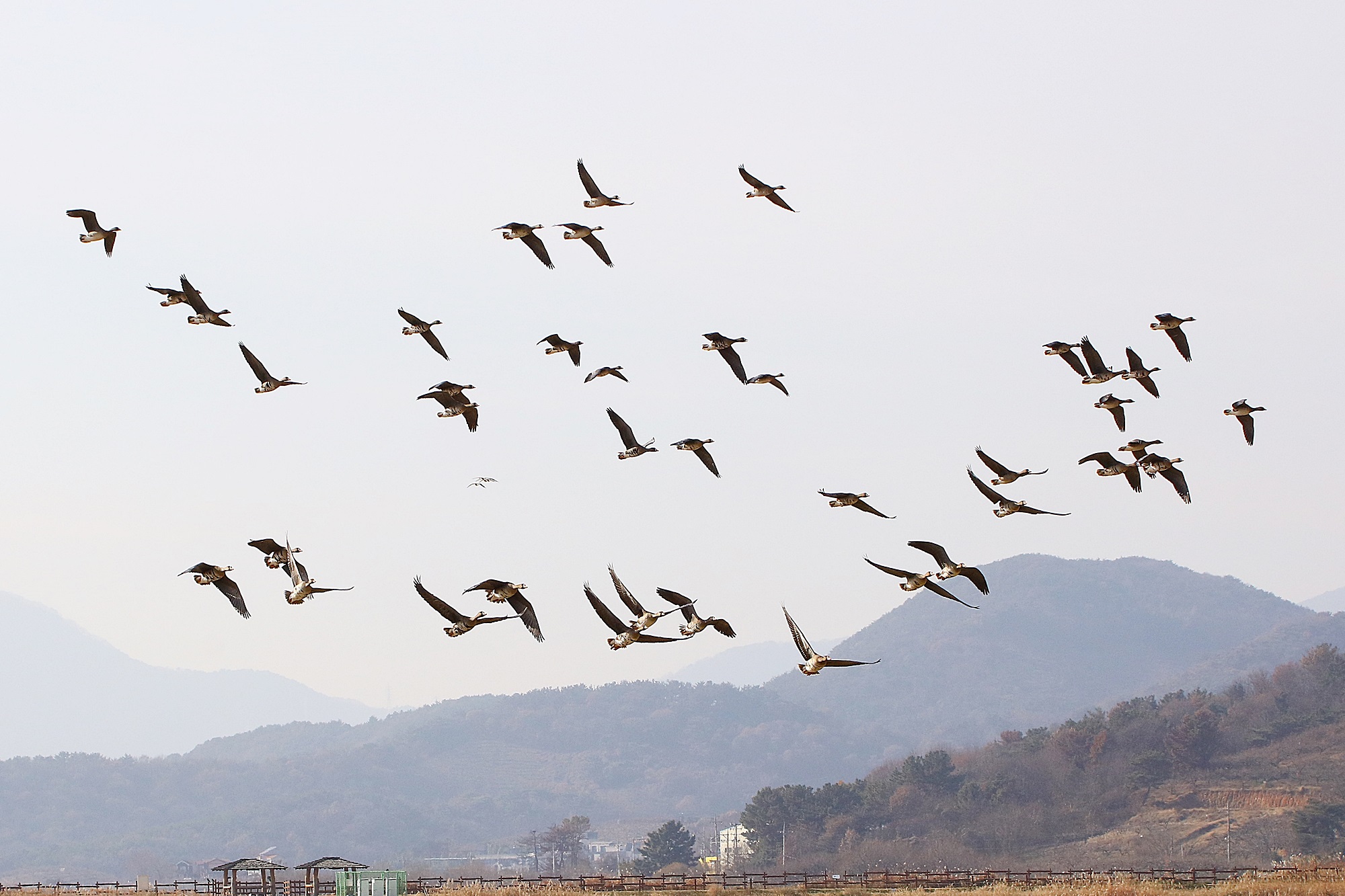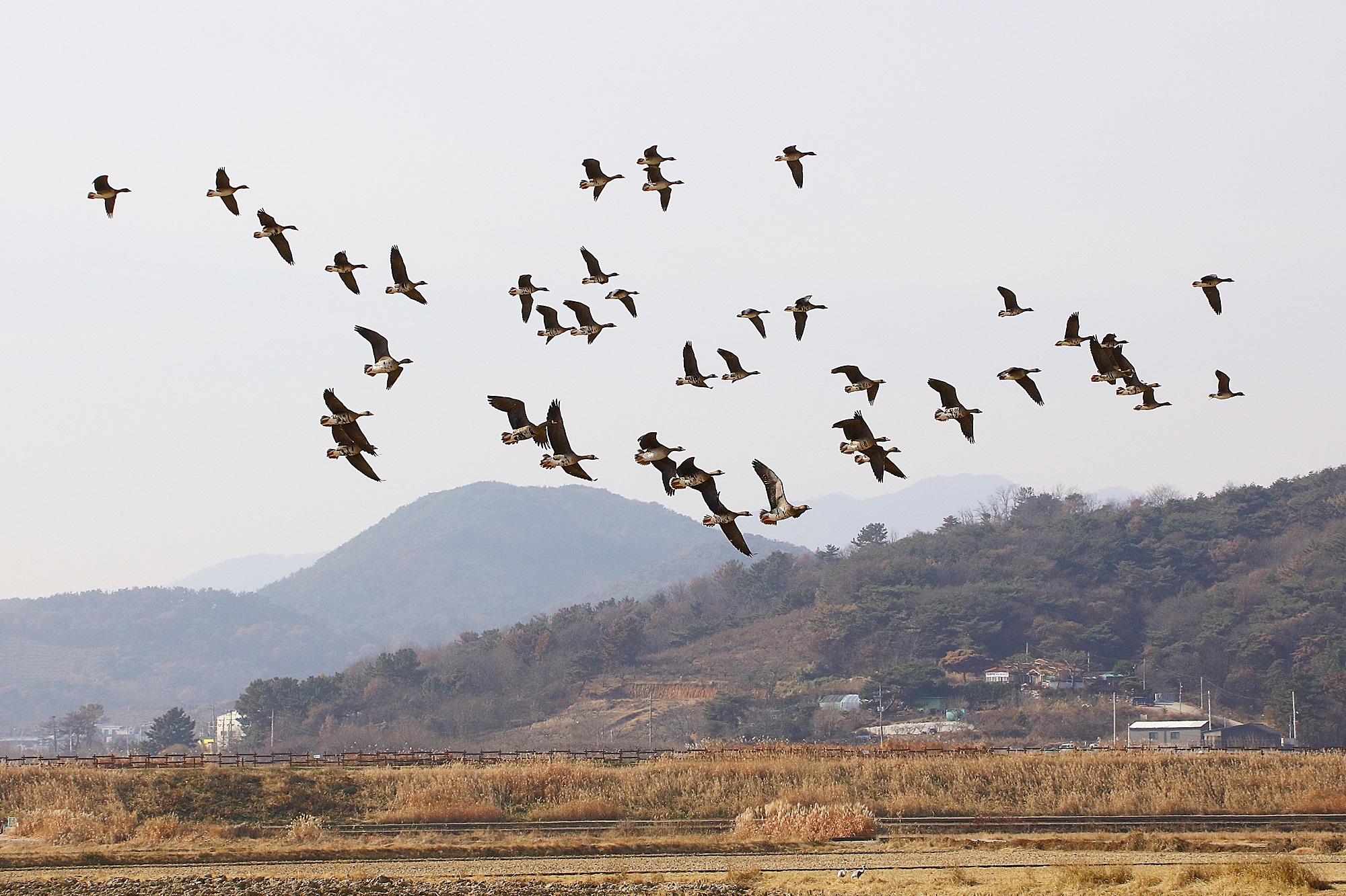 창원 주남지 하늘에 기러기가 날고 있습니다.