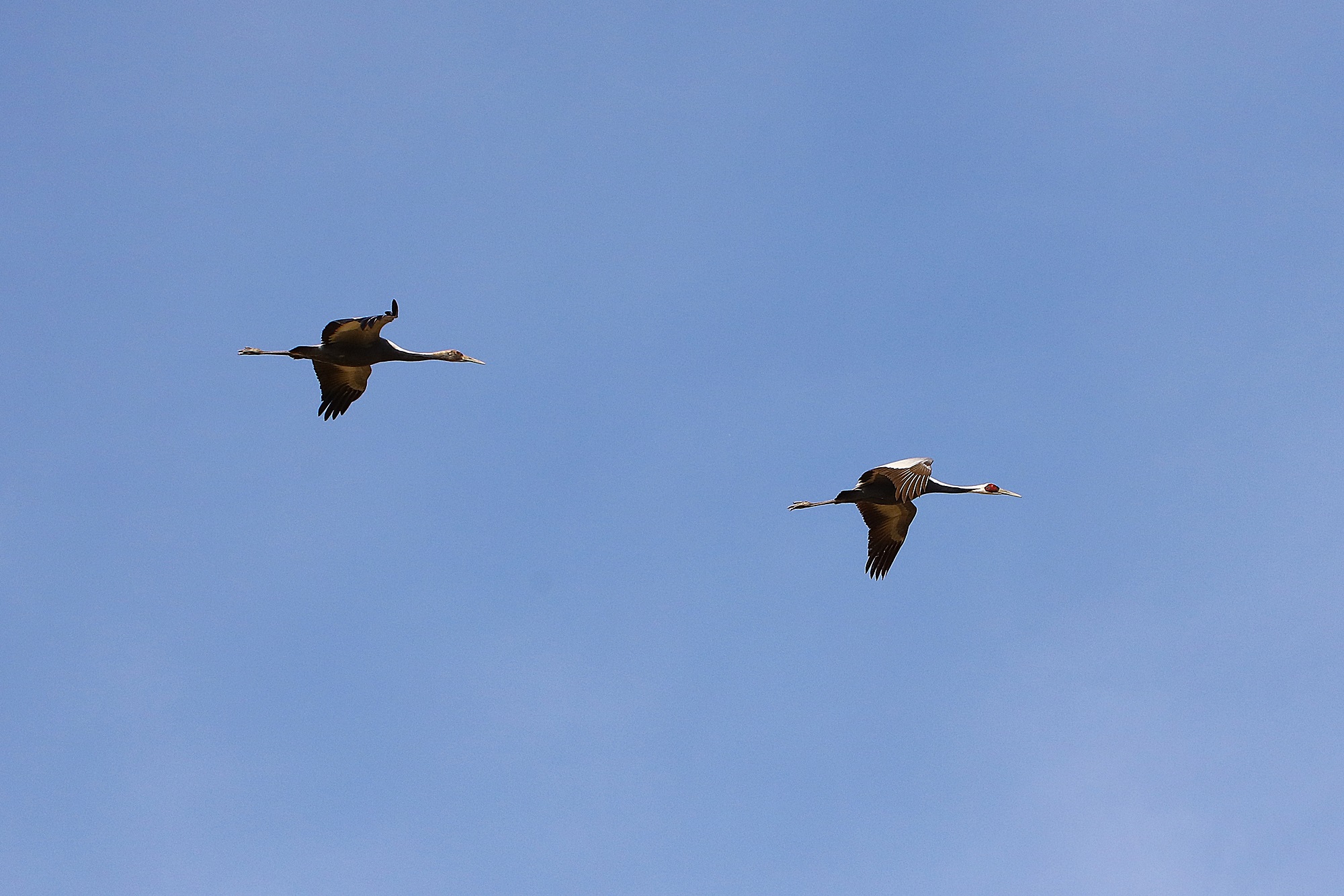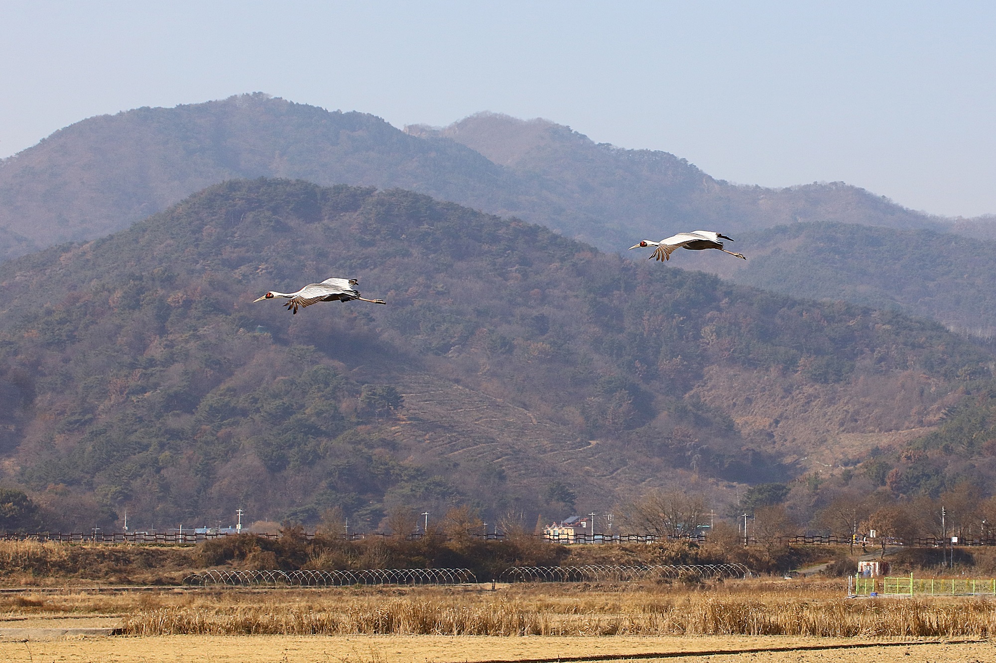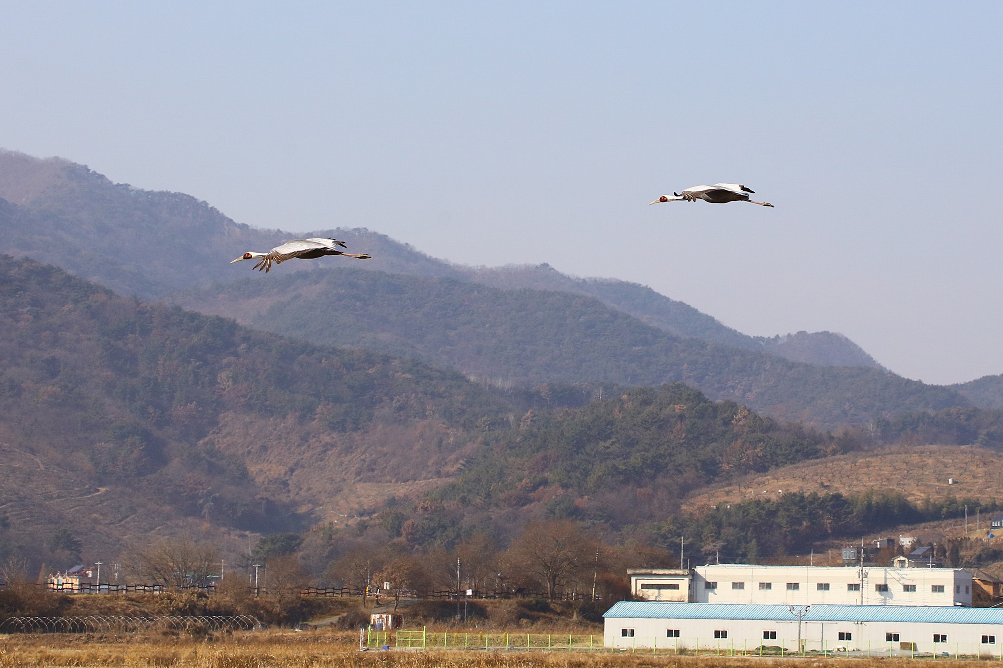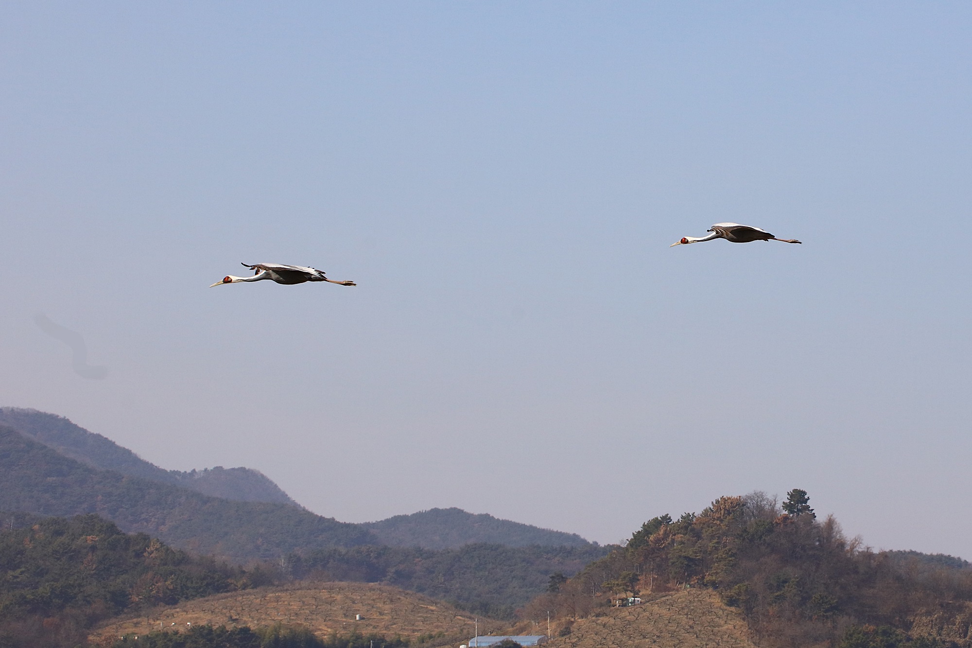 창원 주남지 들의 하늘에 재두루미 2마리가 정답게 날고 있습니다.