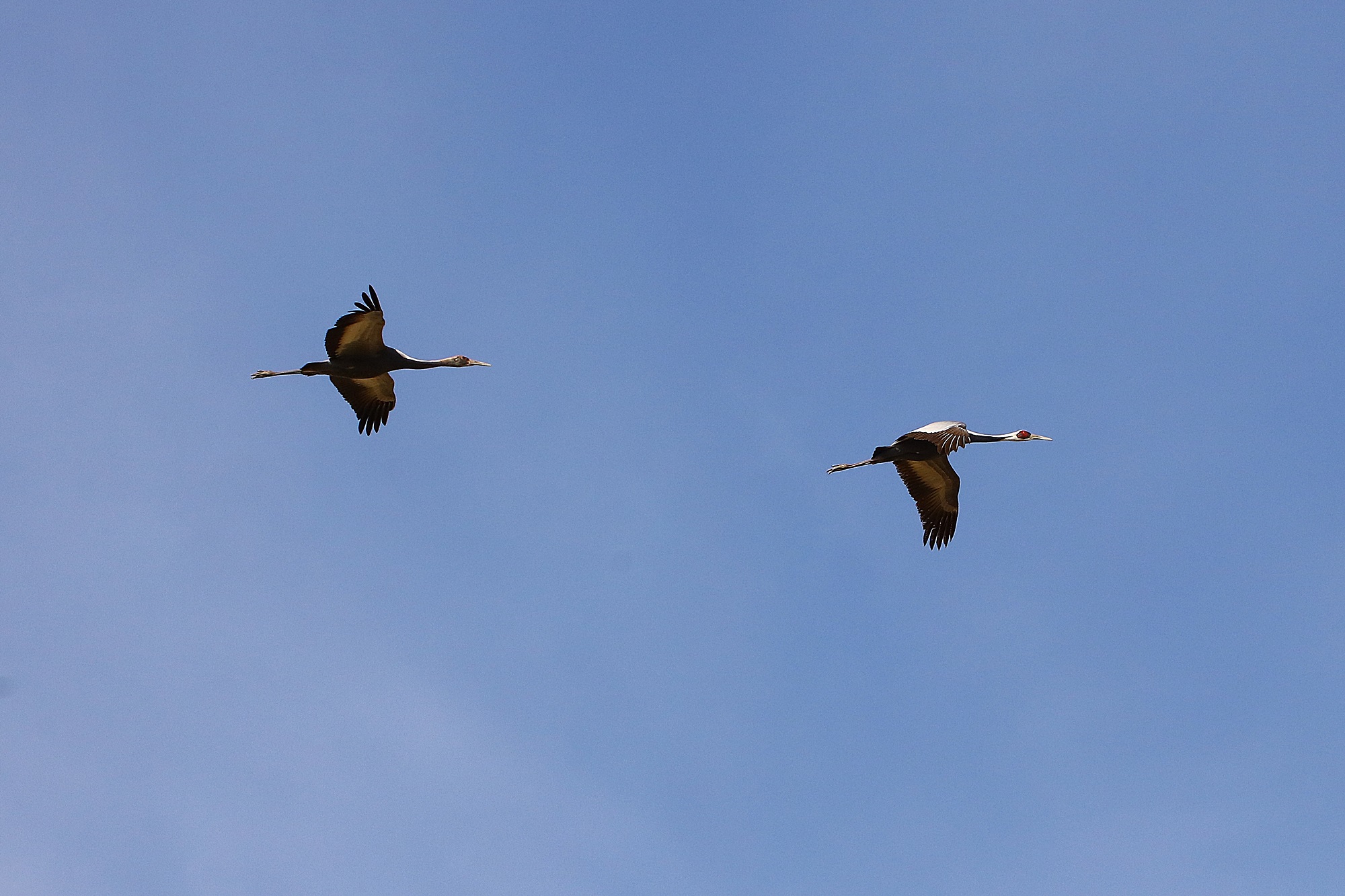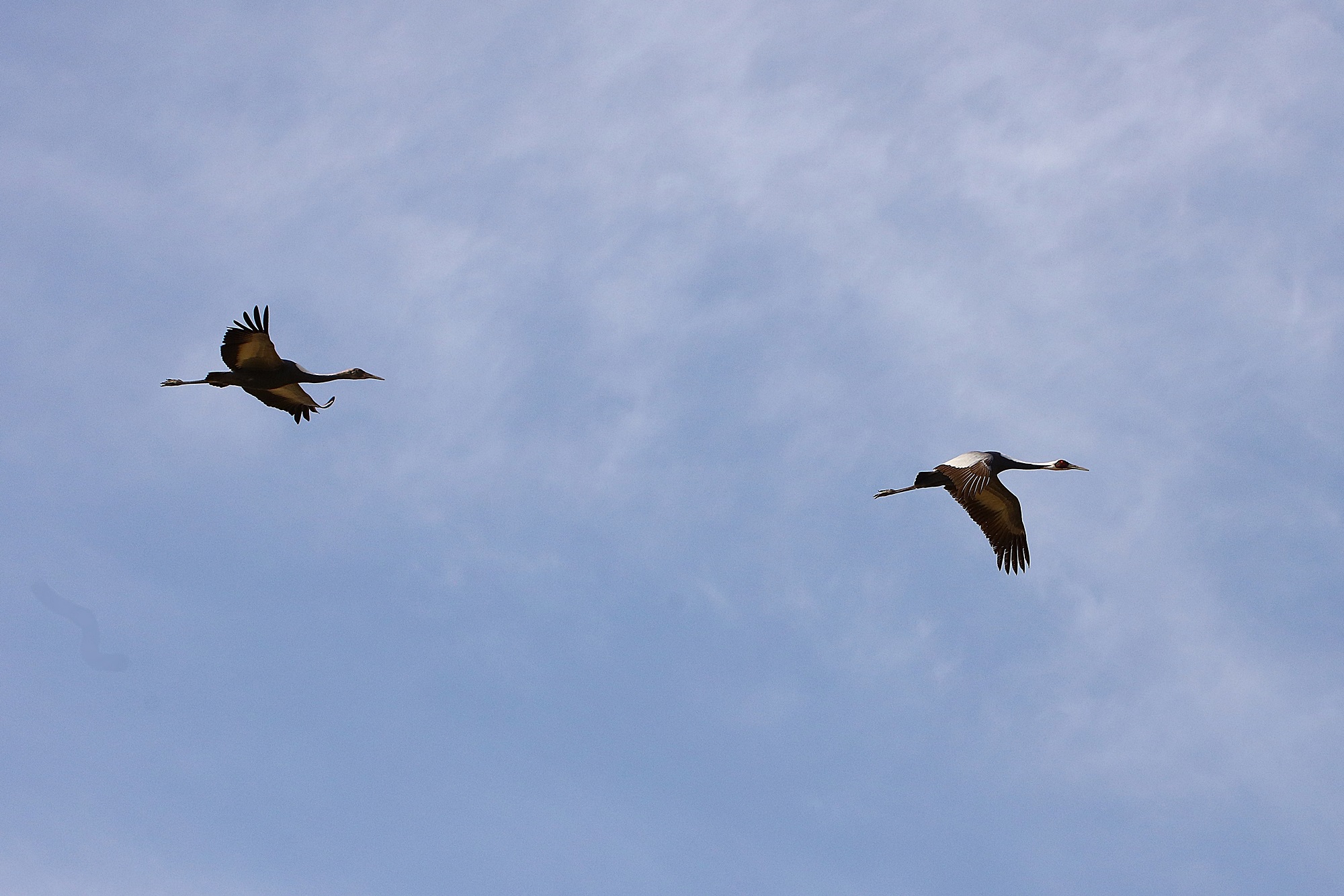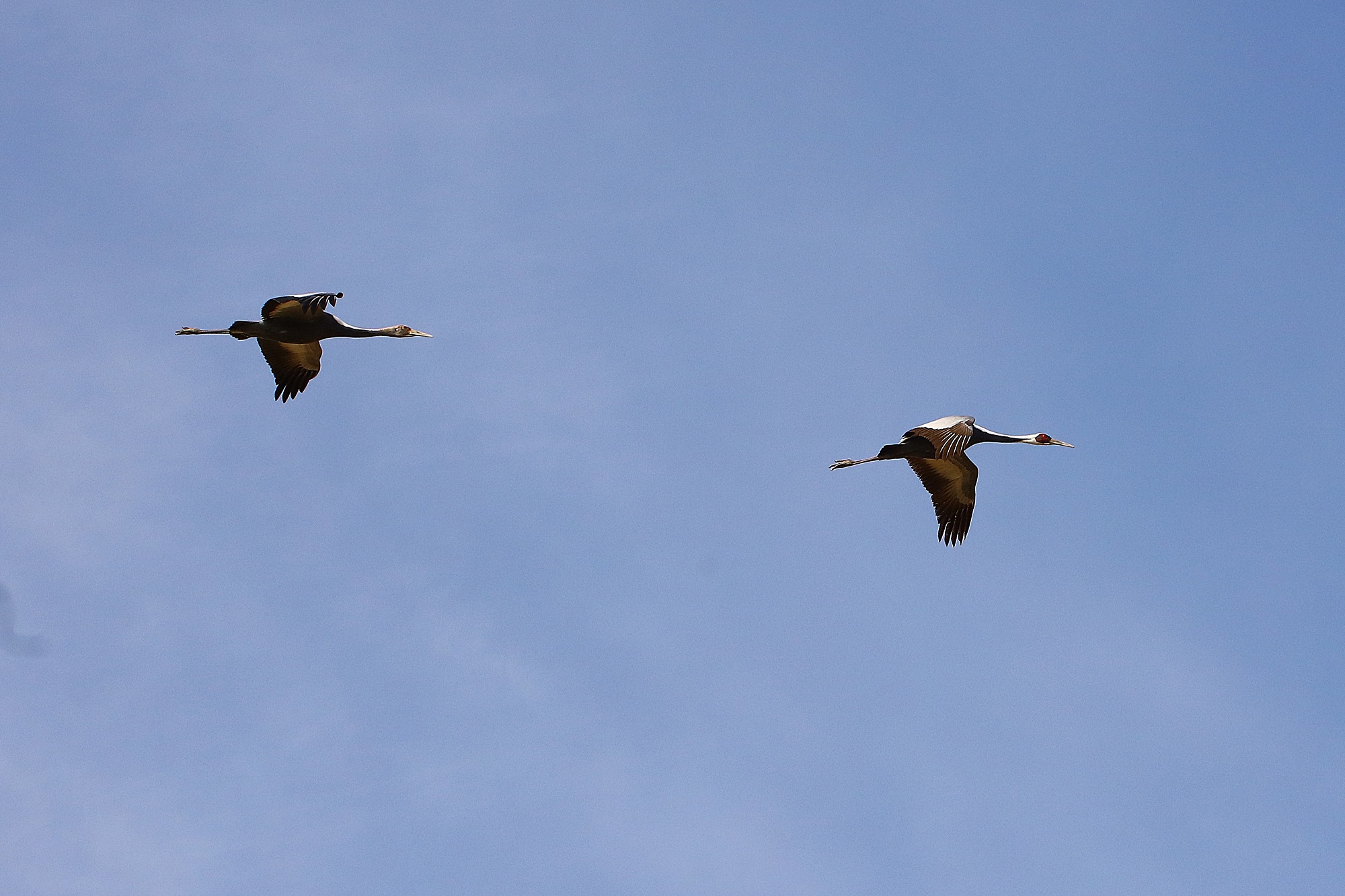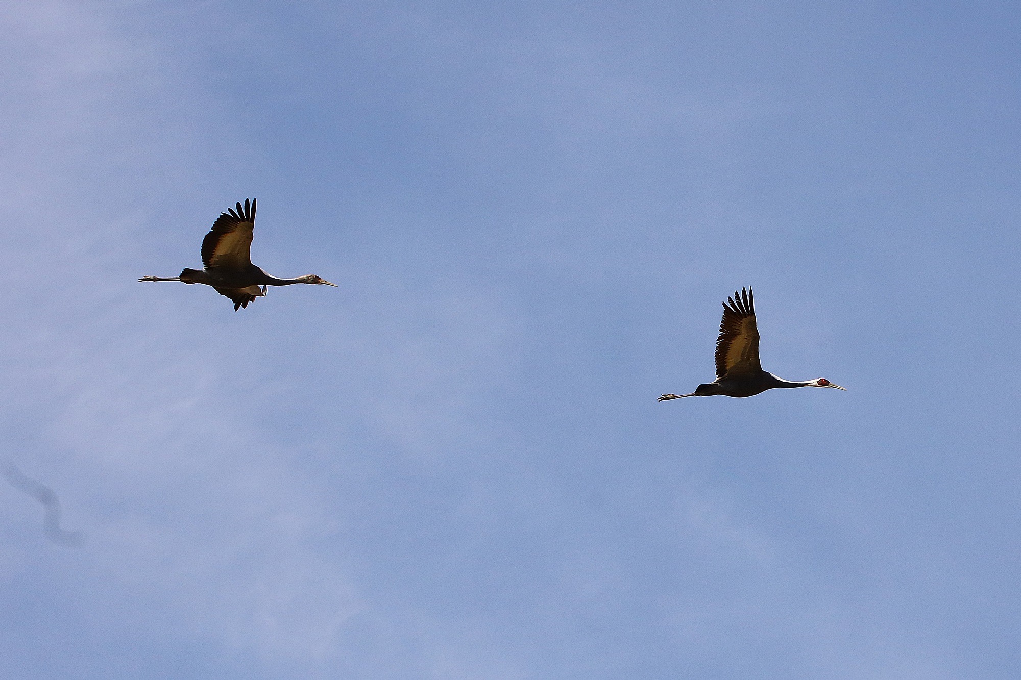 창원 주남지 들의 하늘에 재두루미 2마리가 정답게 날고 있습니다.