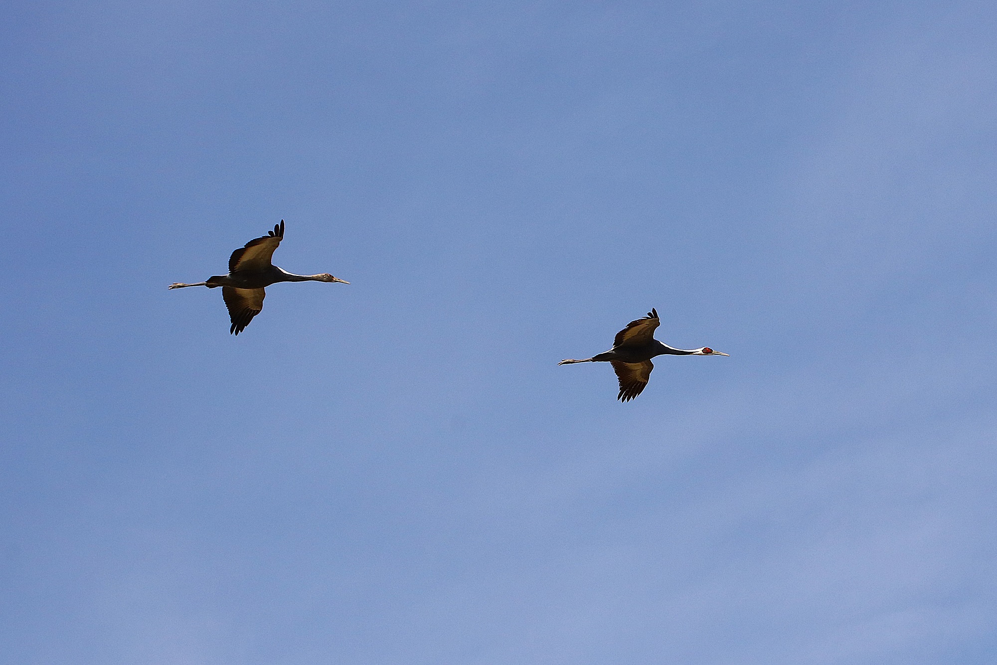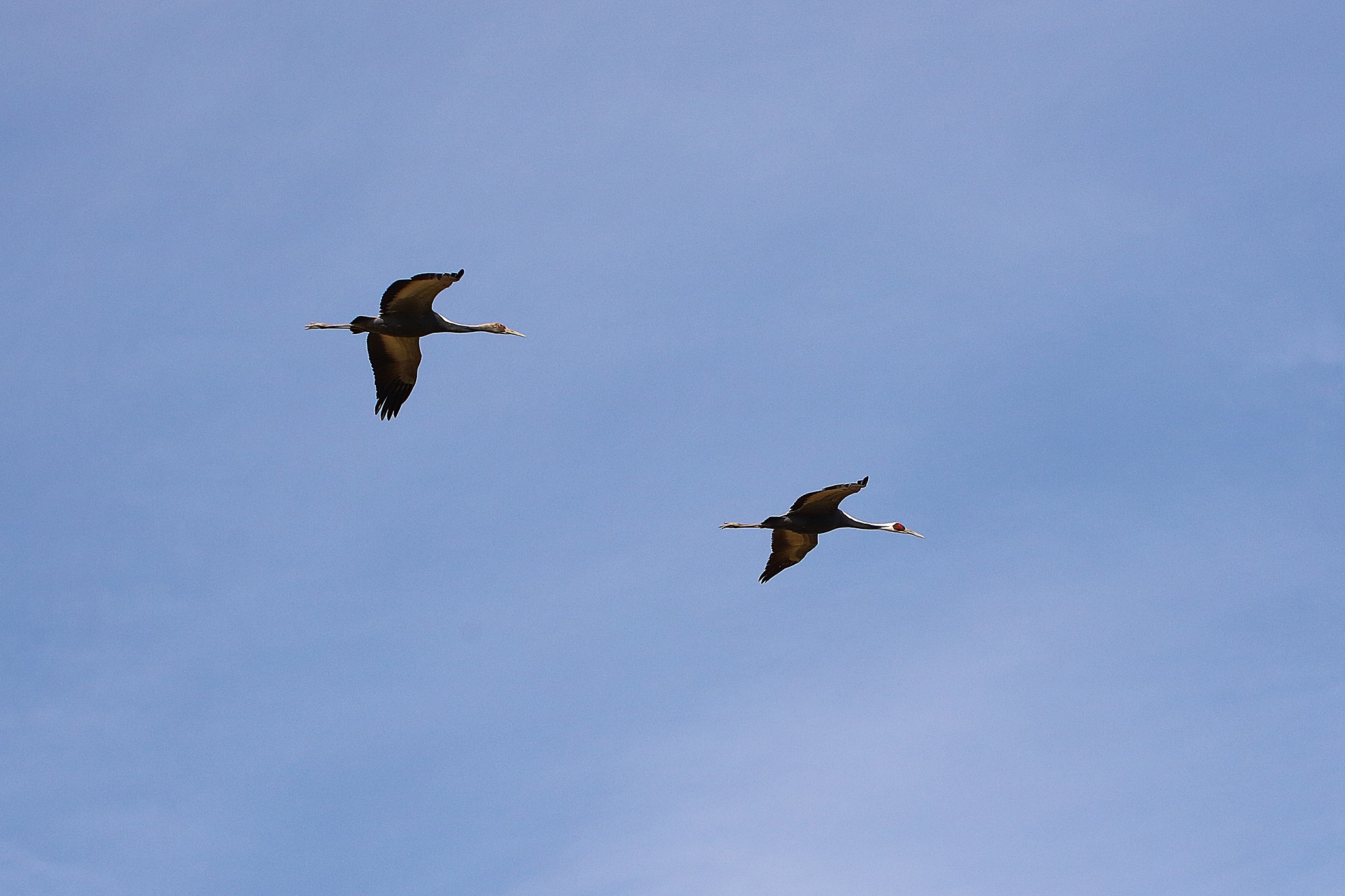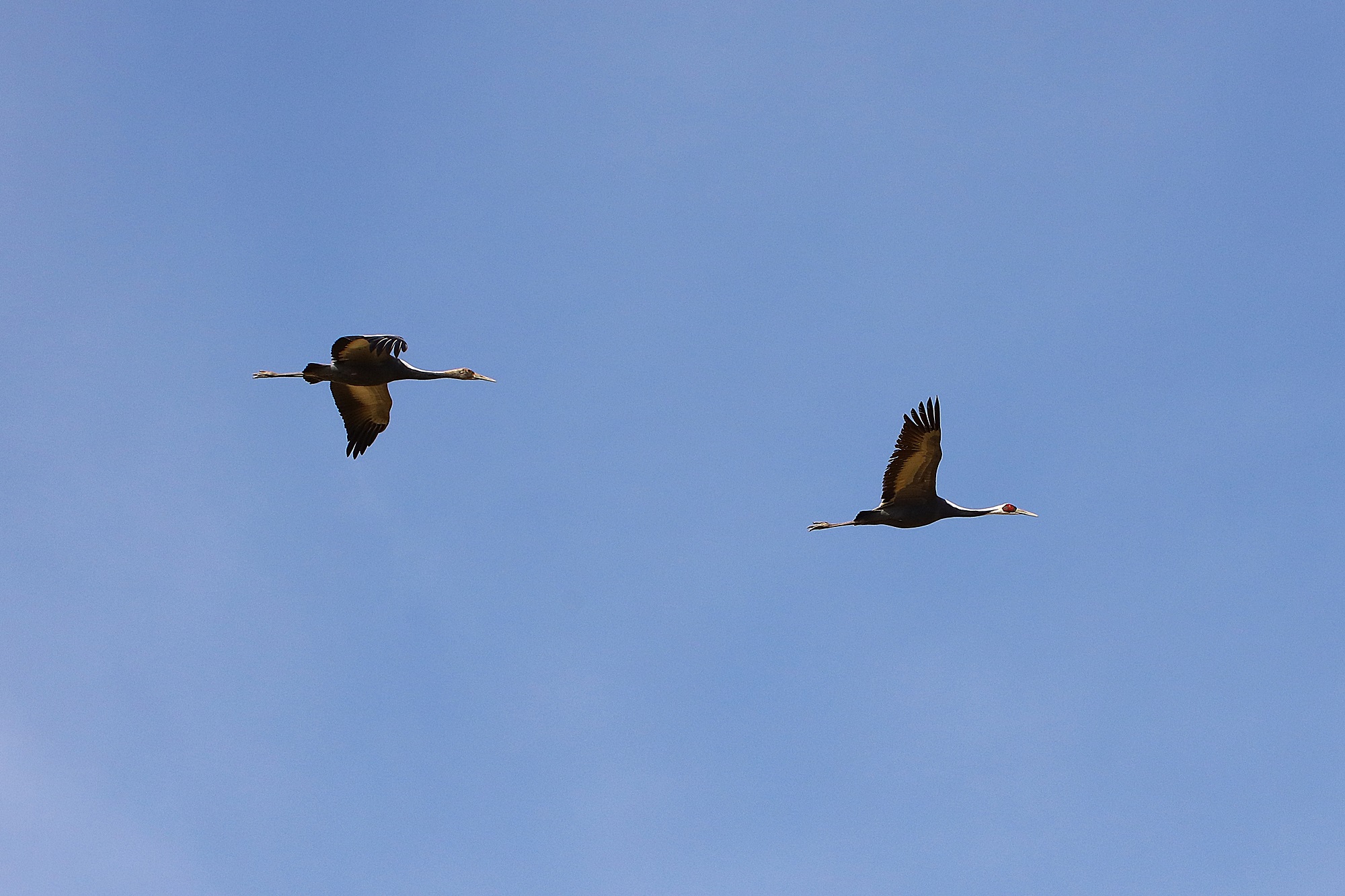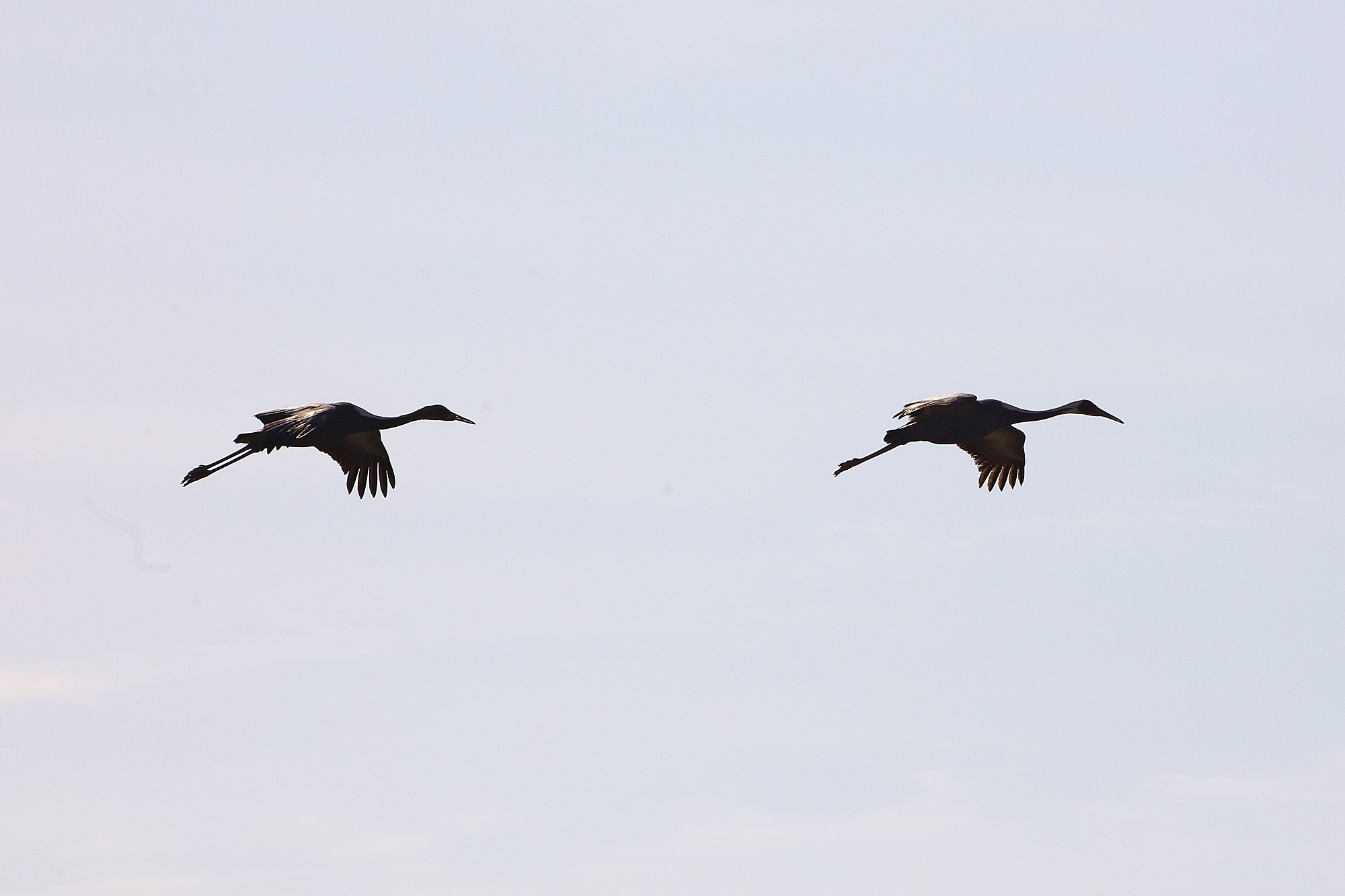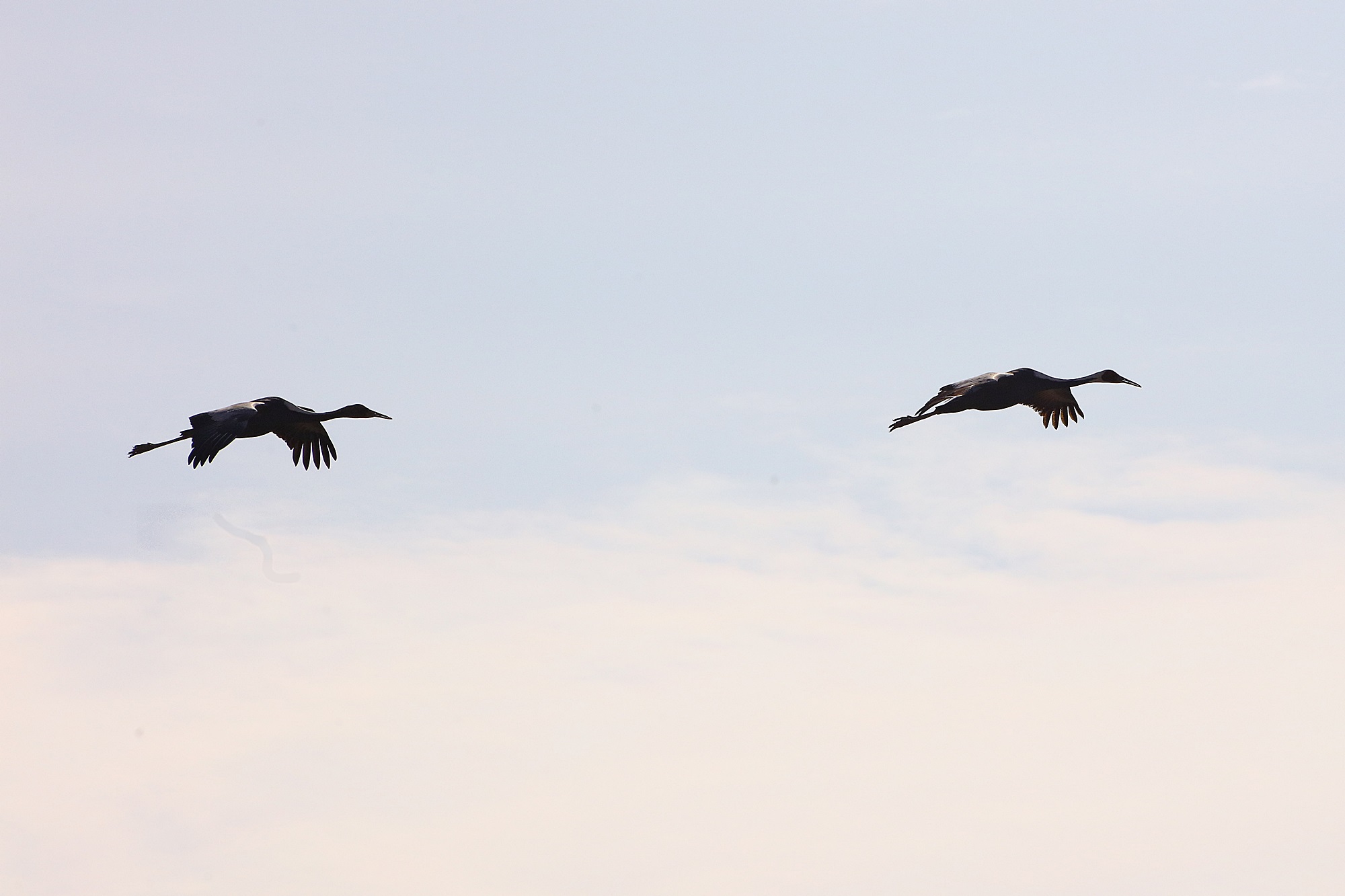 창원 주남지 들의 하늘에 재두루미 2마리가 정답게 날고 있습니다.