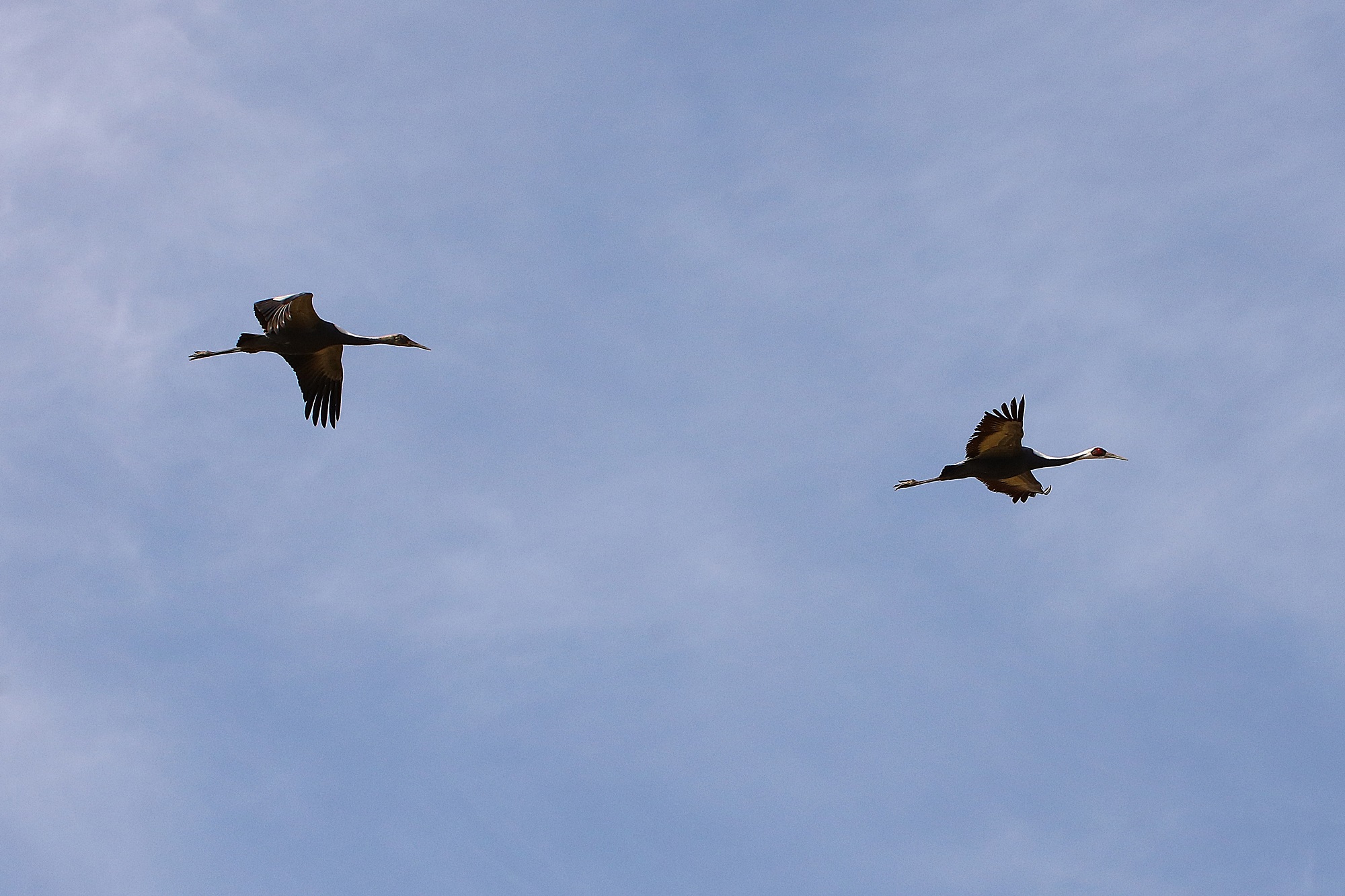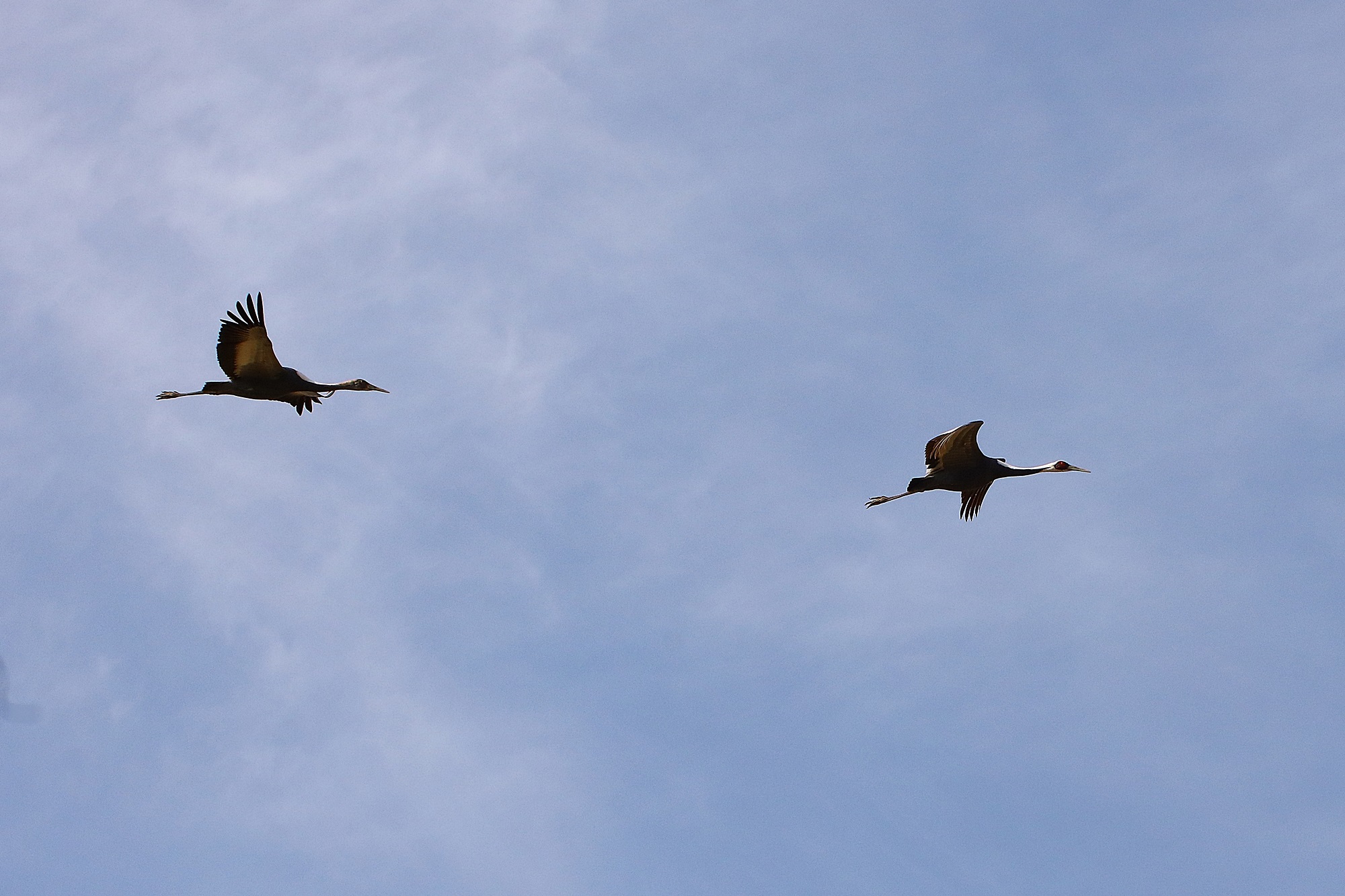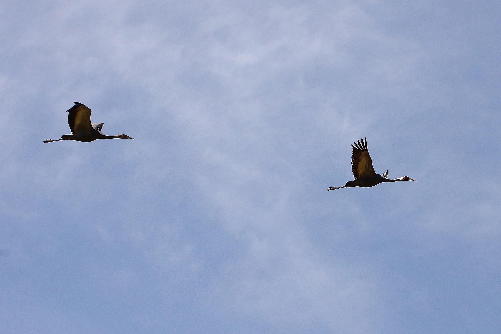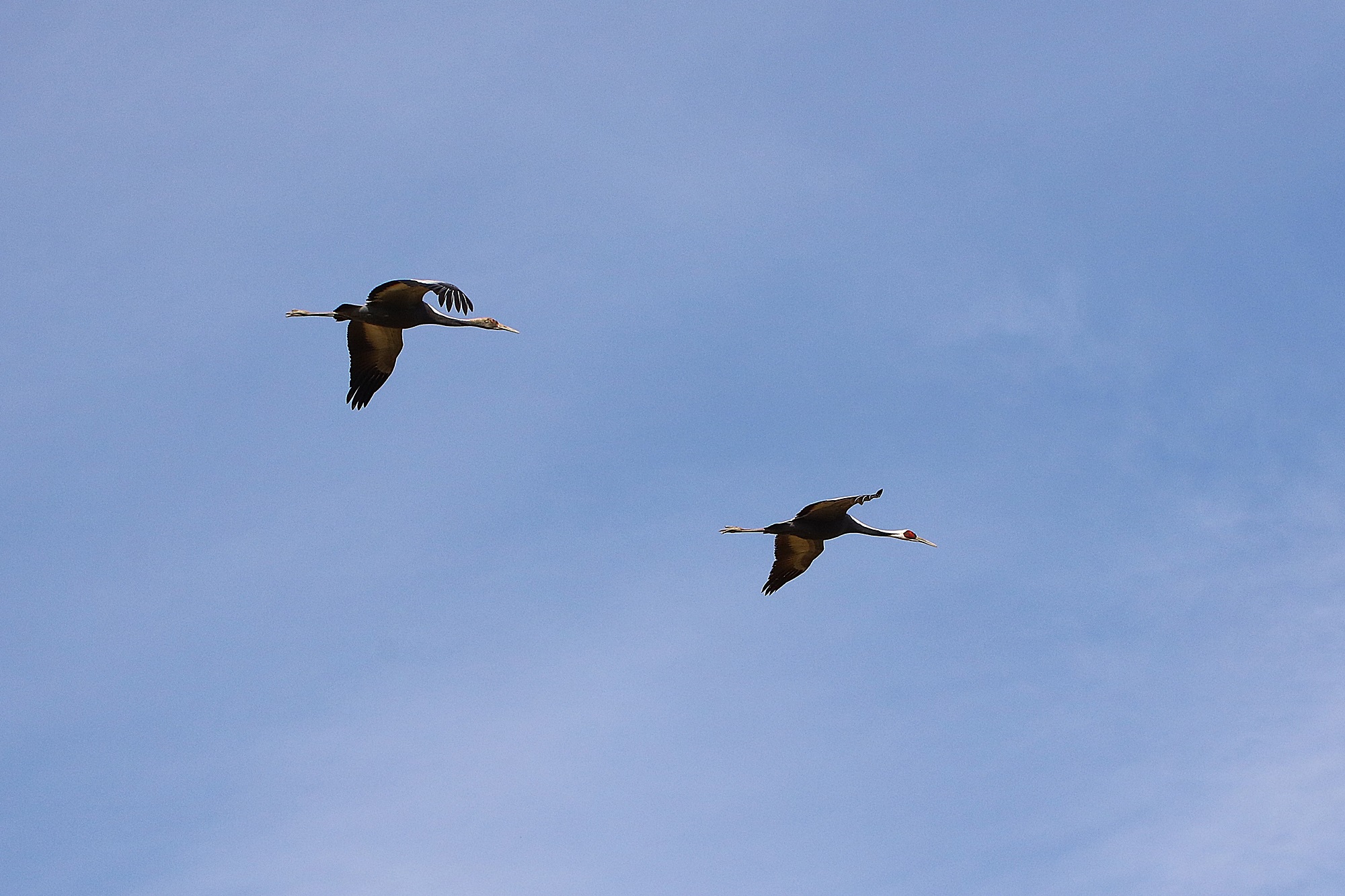 창원 주남지 들의 하늘에 재두루미 2마리가 정답게 날고 있습니다.