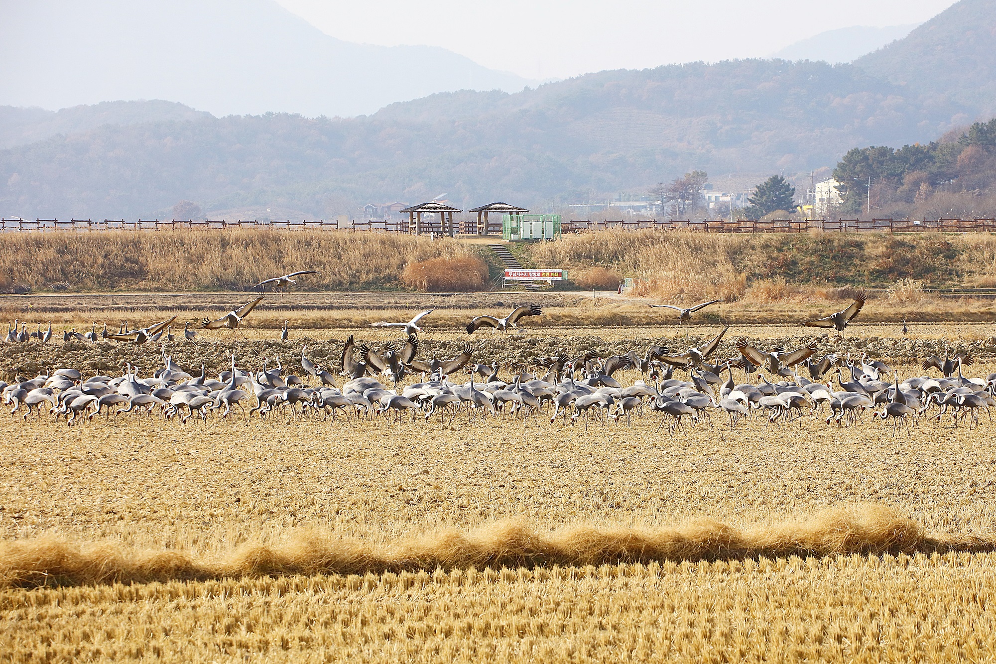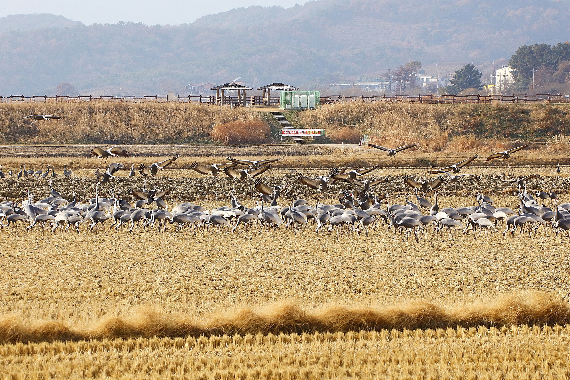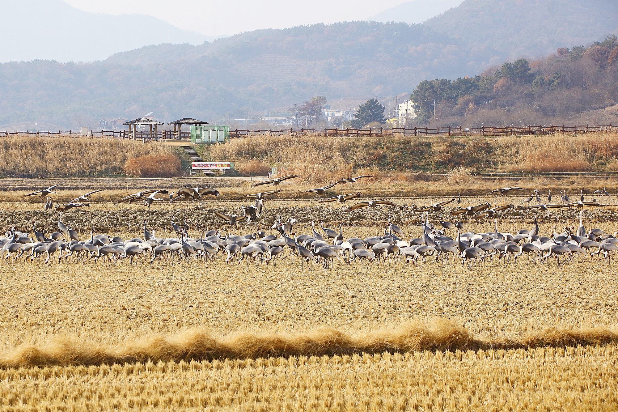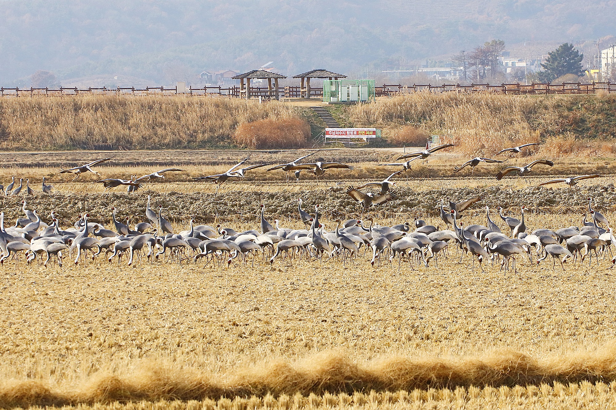창원 주남지 들 위를 날던 재두루미가 주남들에 내려앉습니다.