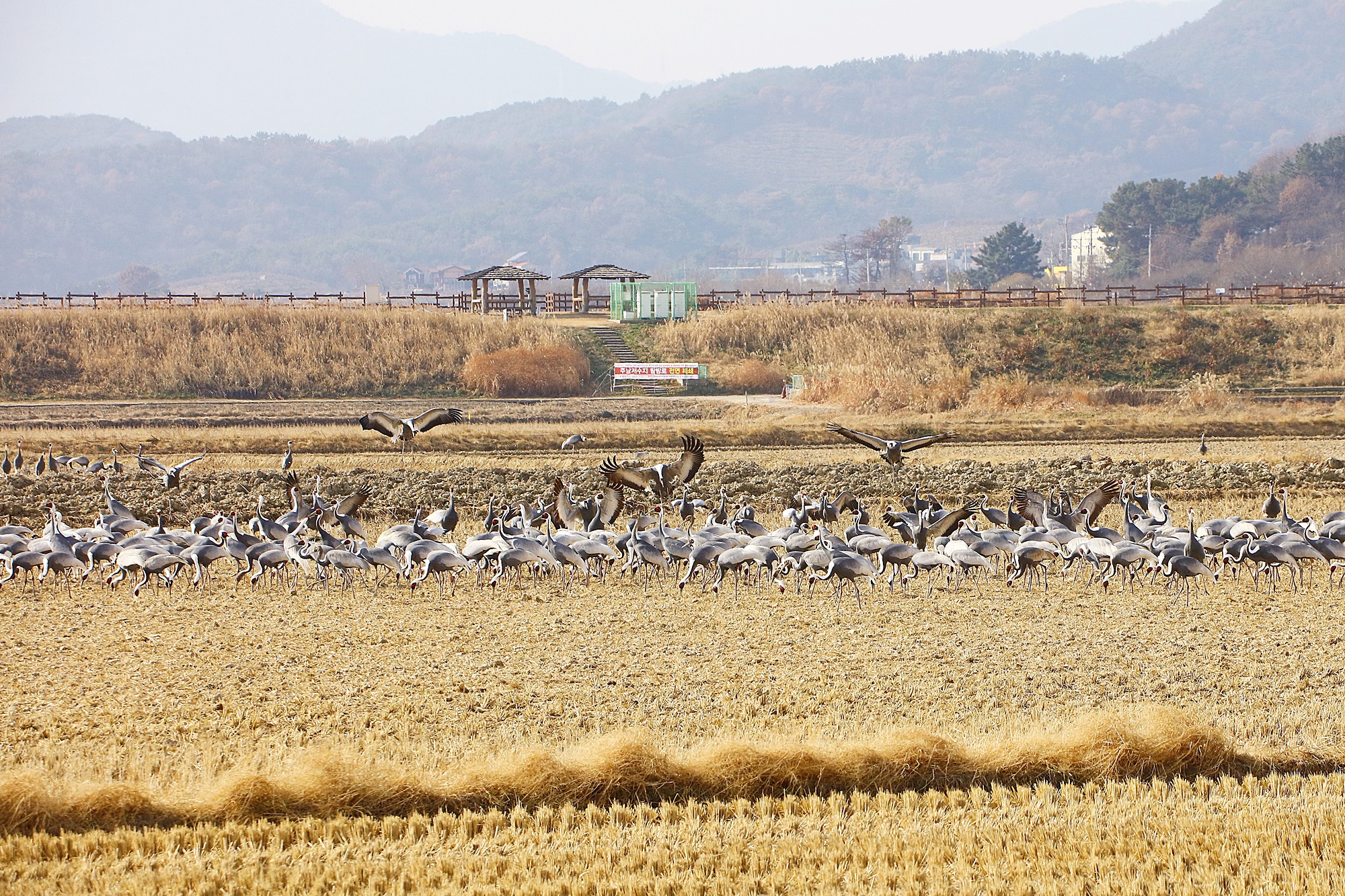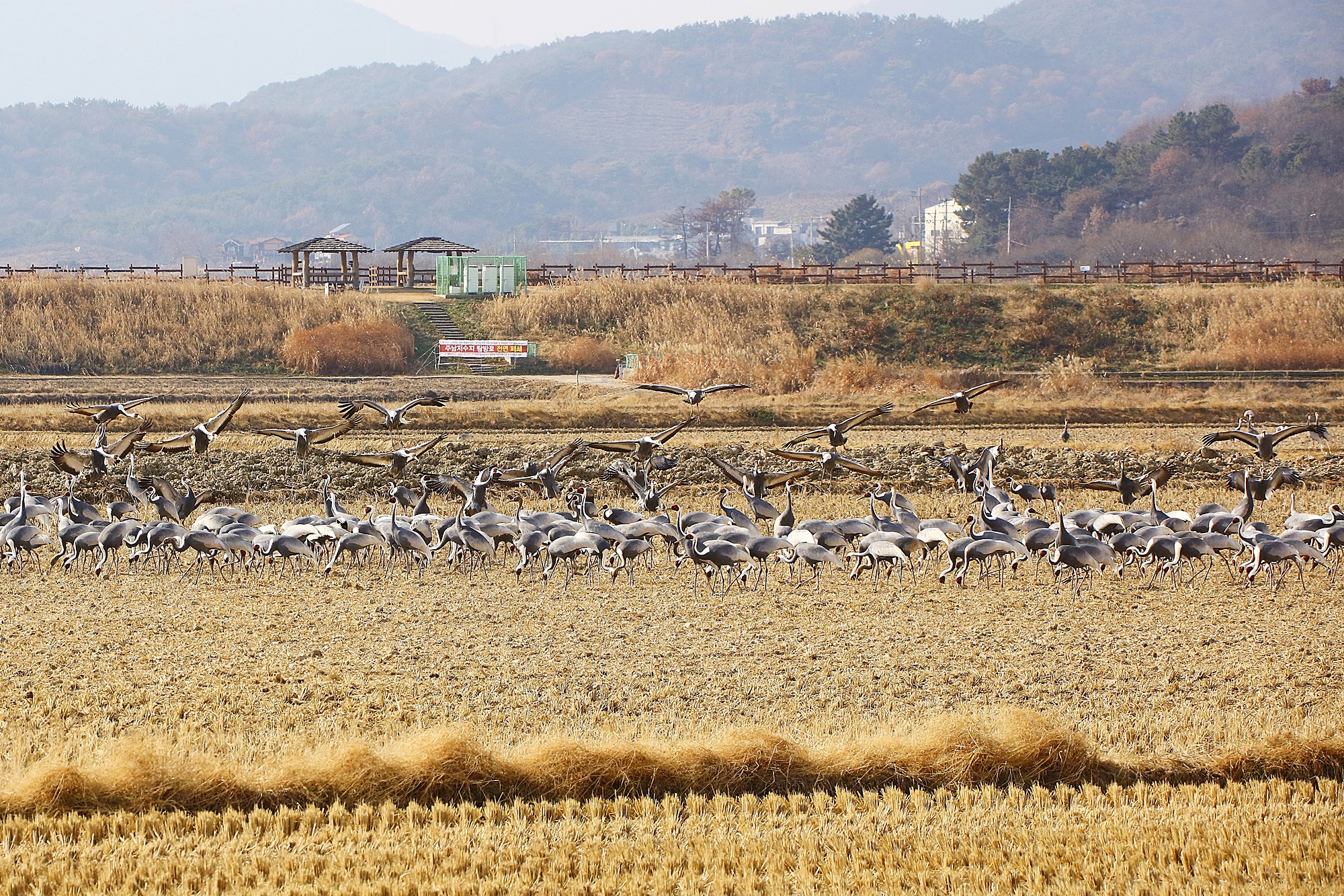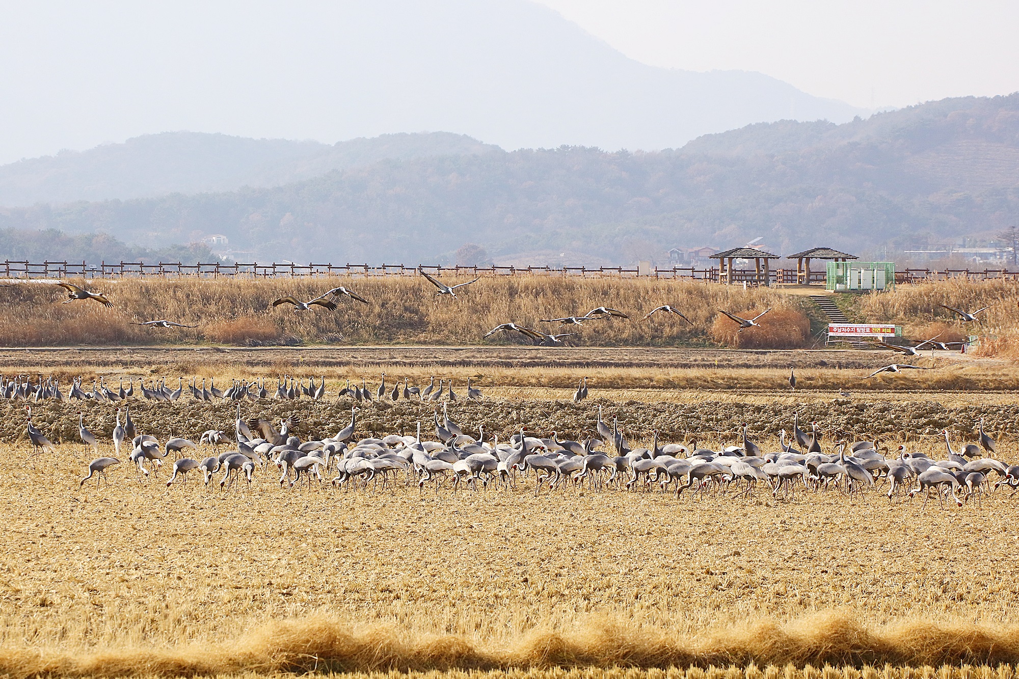 창원 주남지 들 위를 날던 재두루미가 주남들에 내려앉습니다.