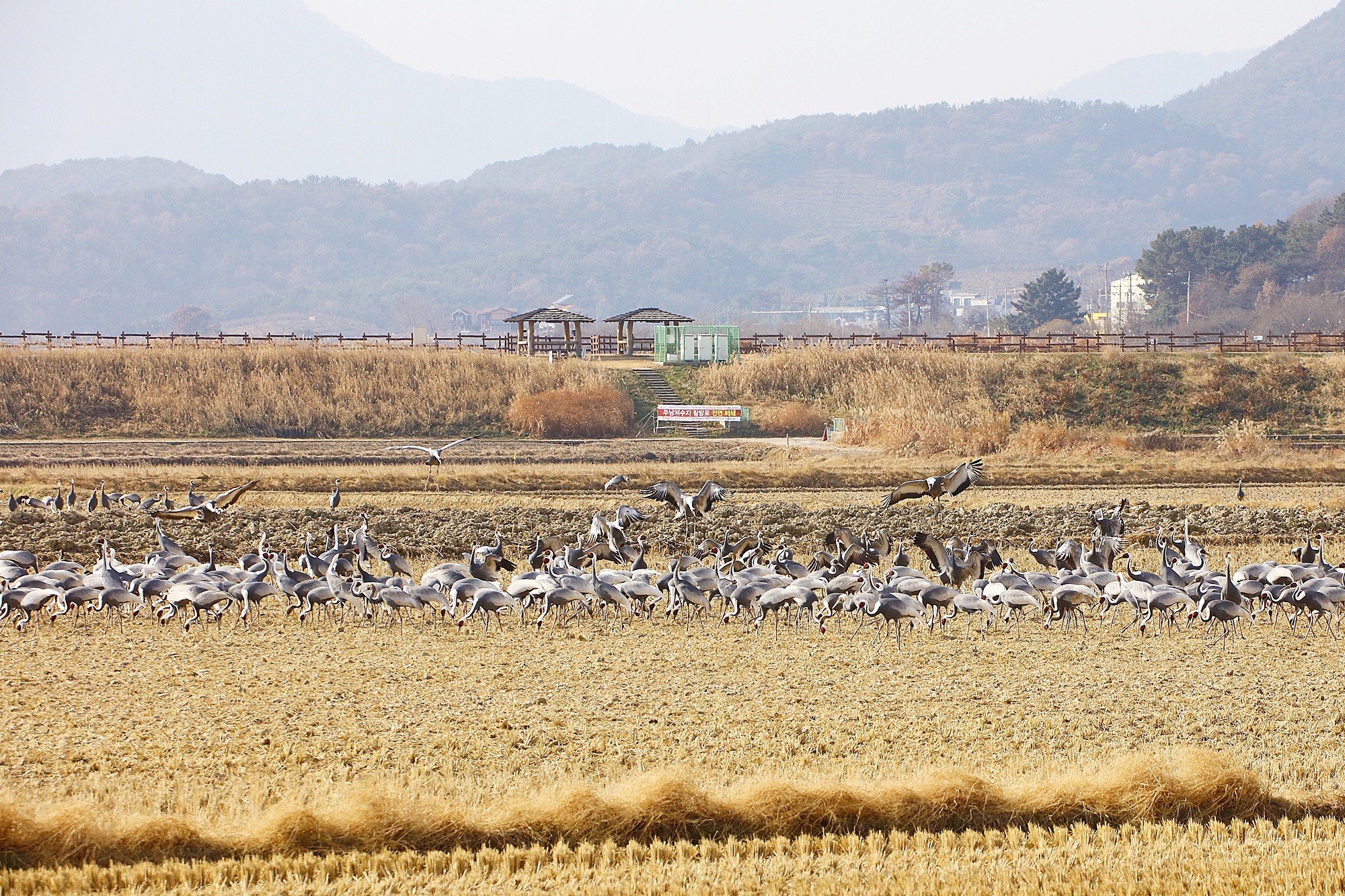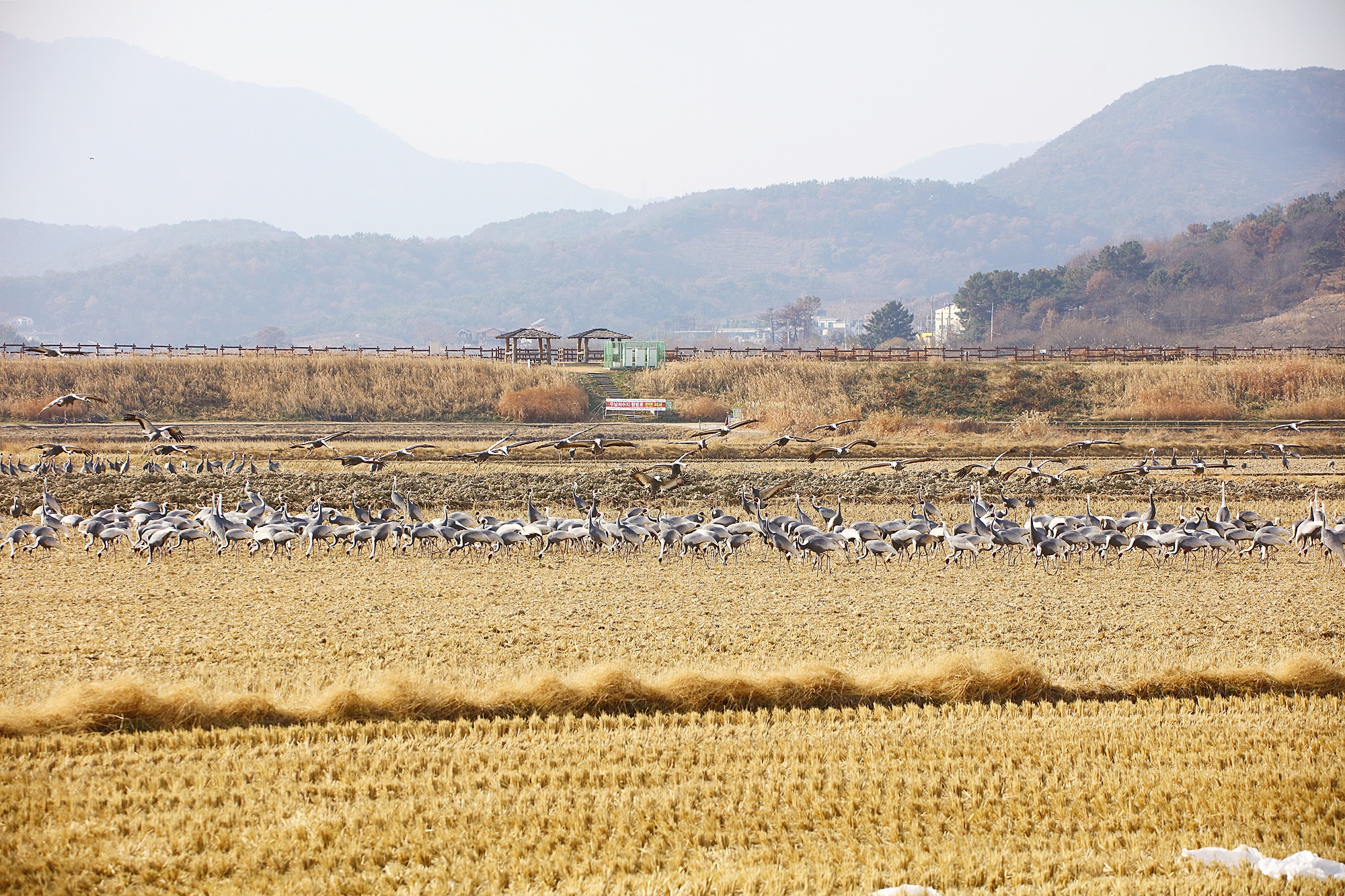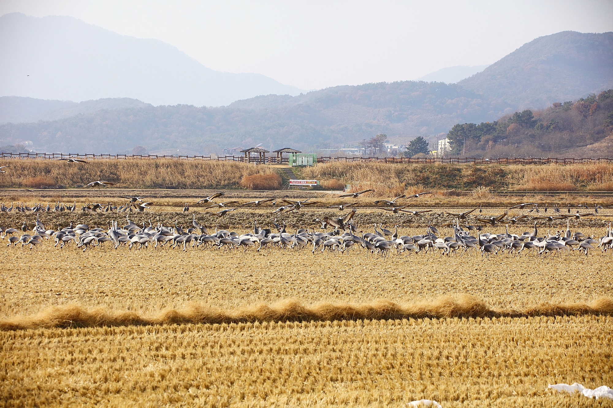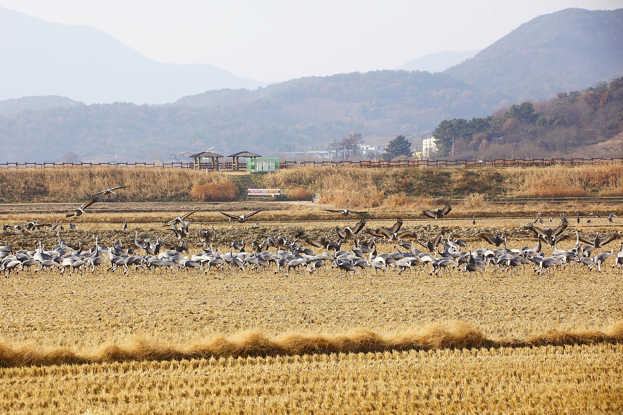 창원 주남지 들 위를 날던 재두루미가 주남들에 내려앉습니다.