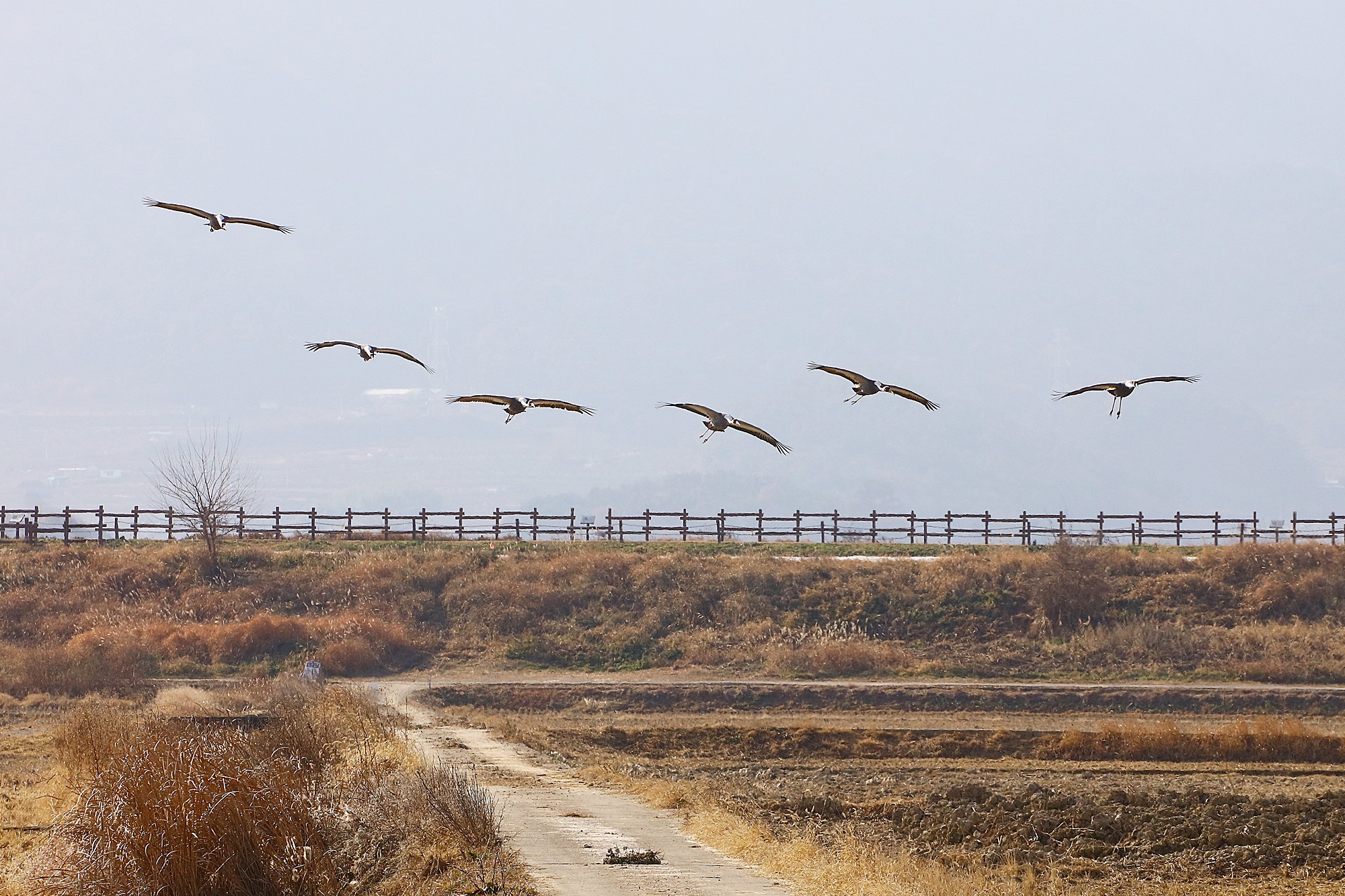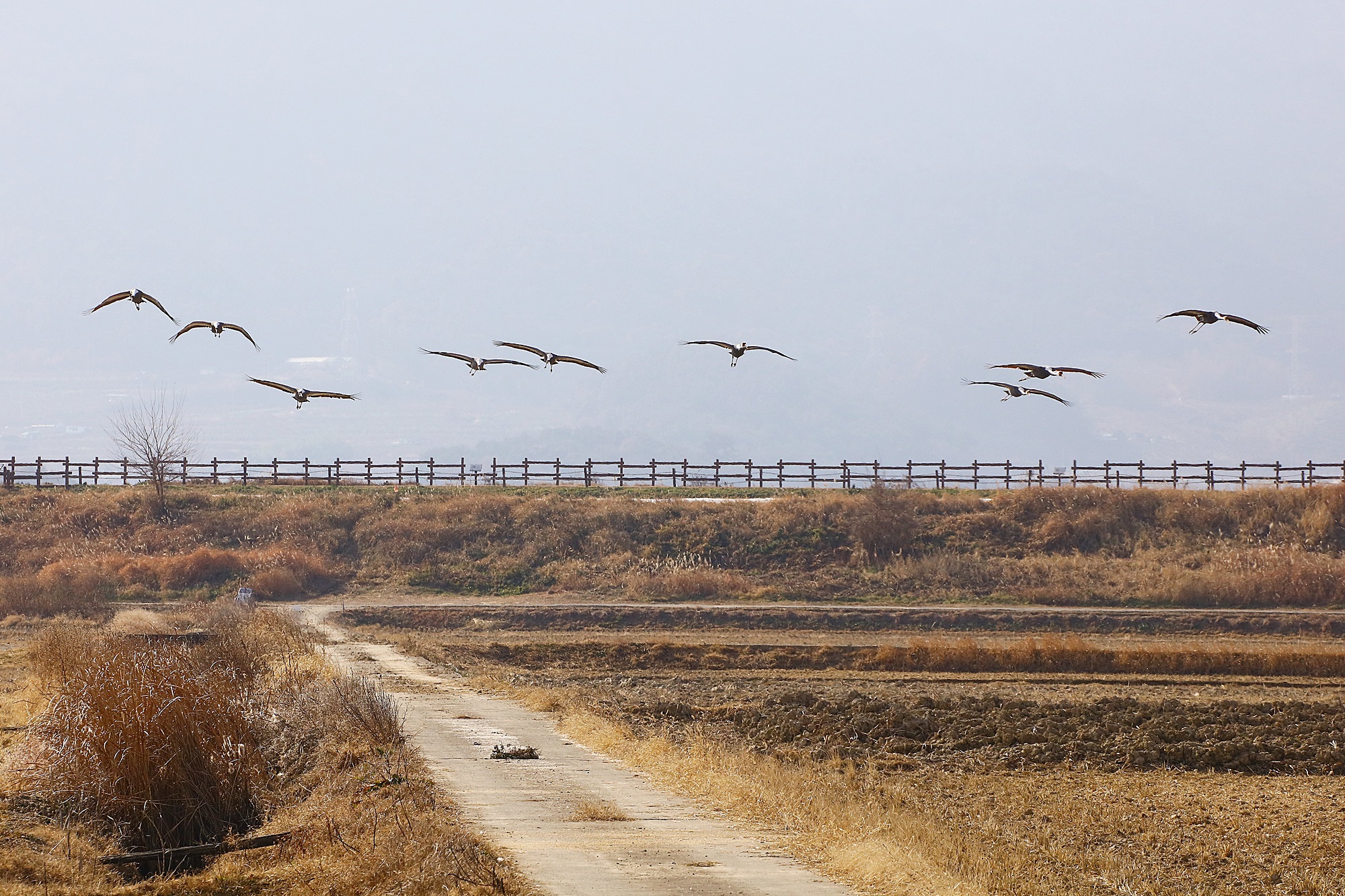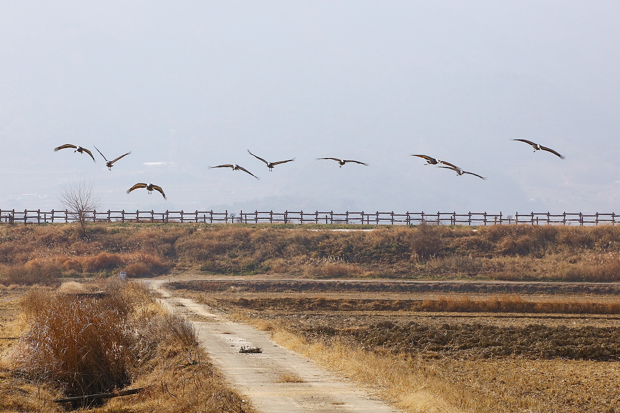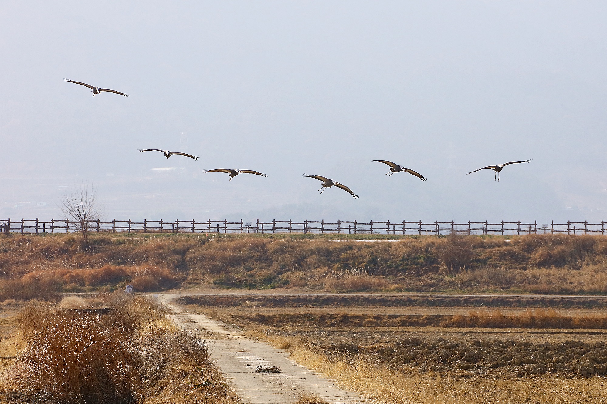 창원 주남지 들의 하늘에 재두루미가 날고 있습니다.