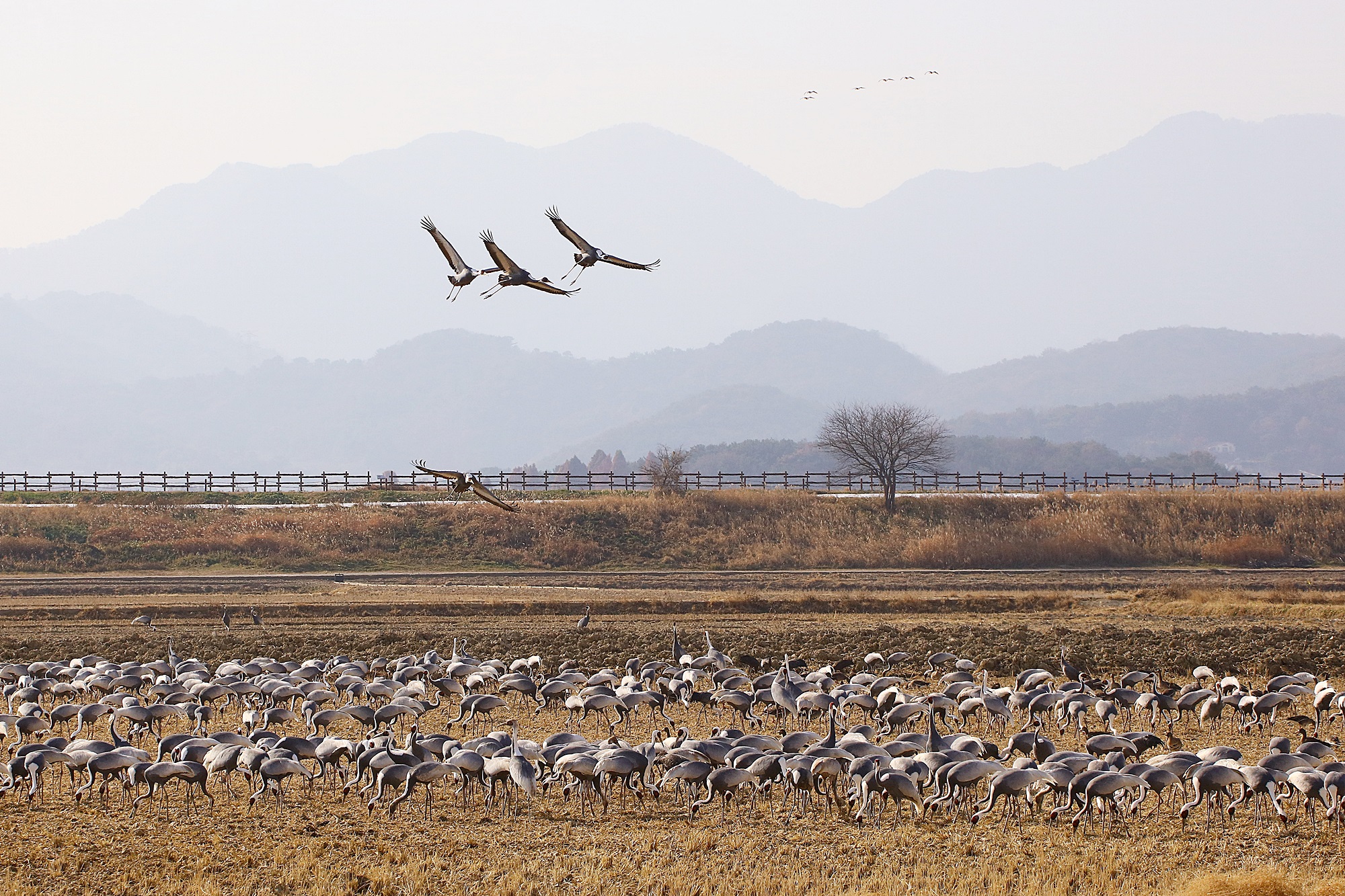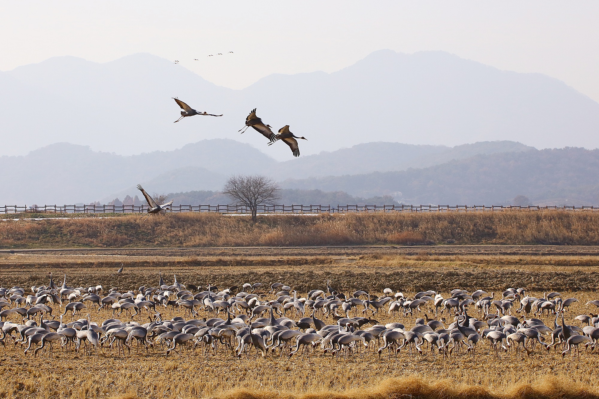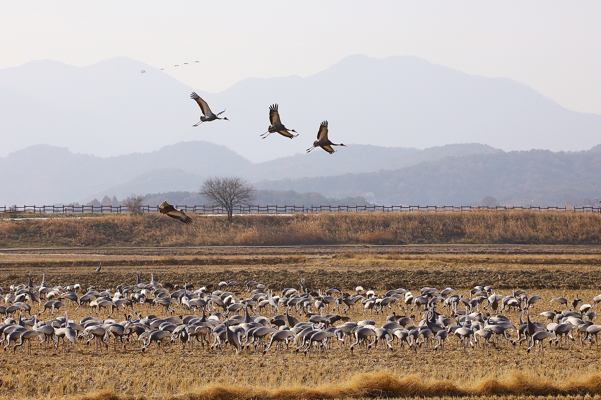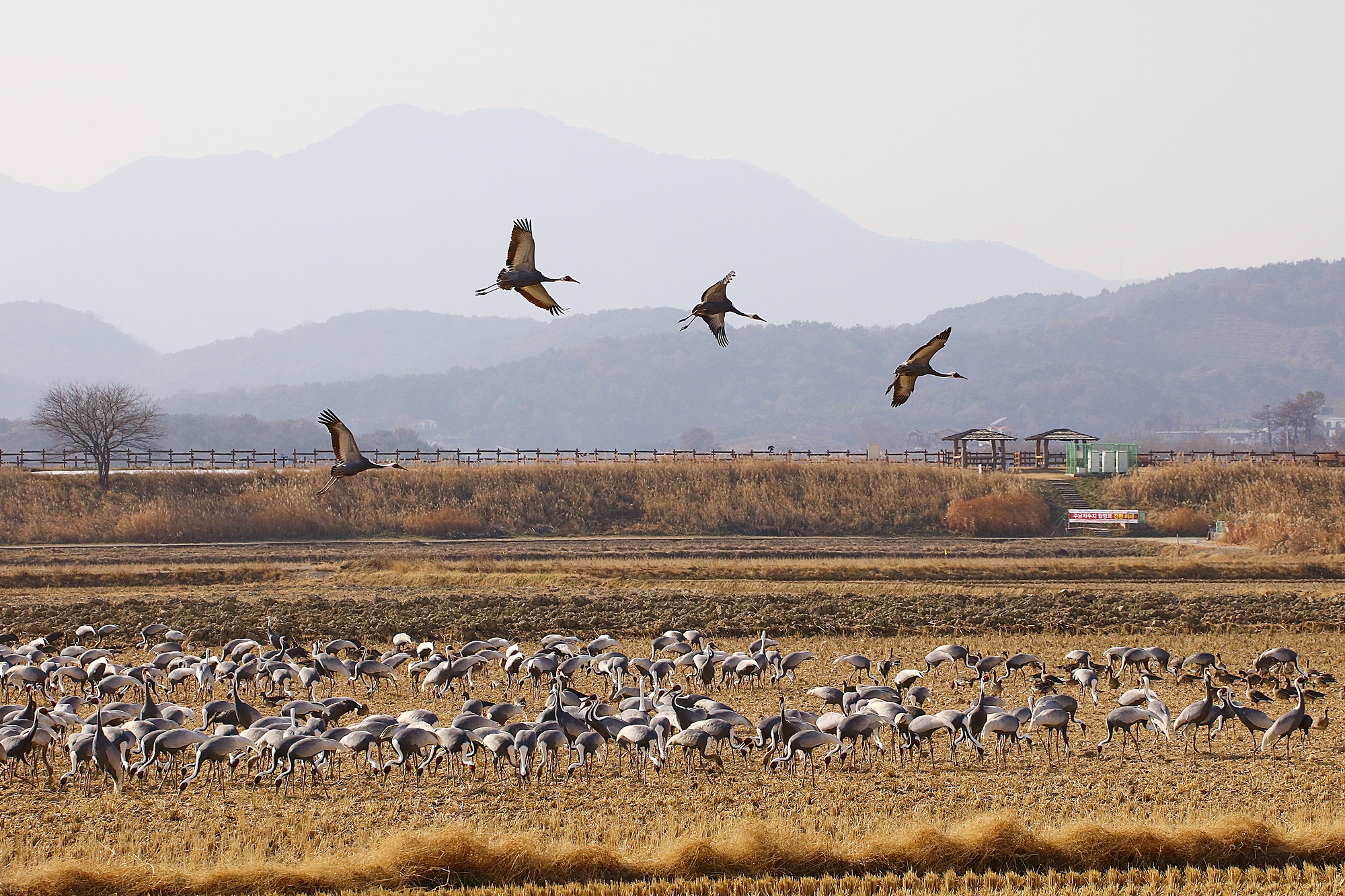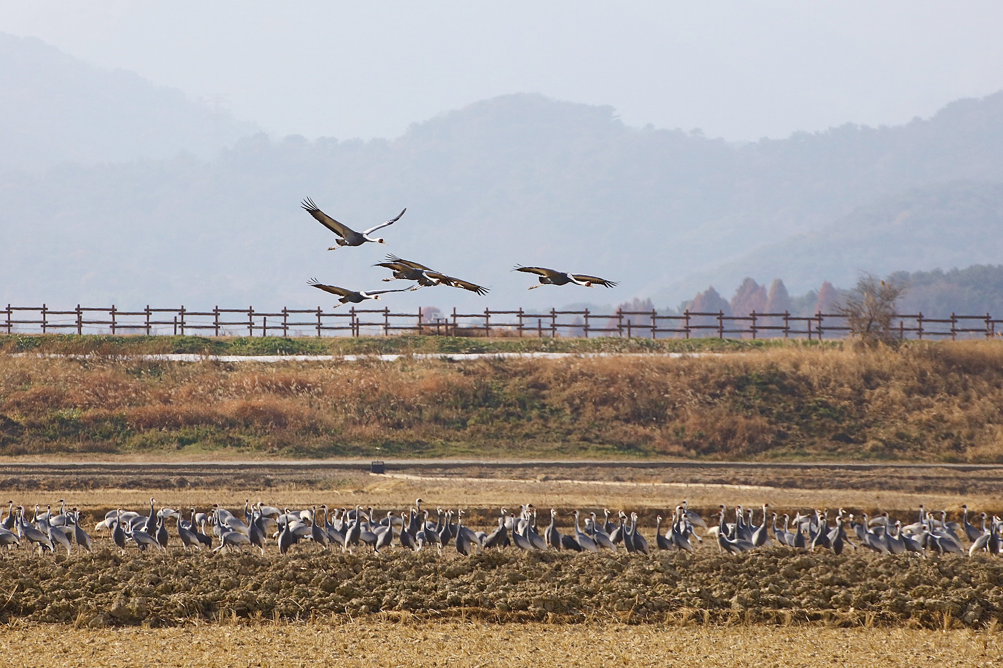 창원 주남지 들의 하늘에 재두루미가 날고 있습니다.