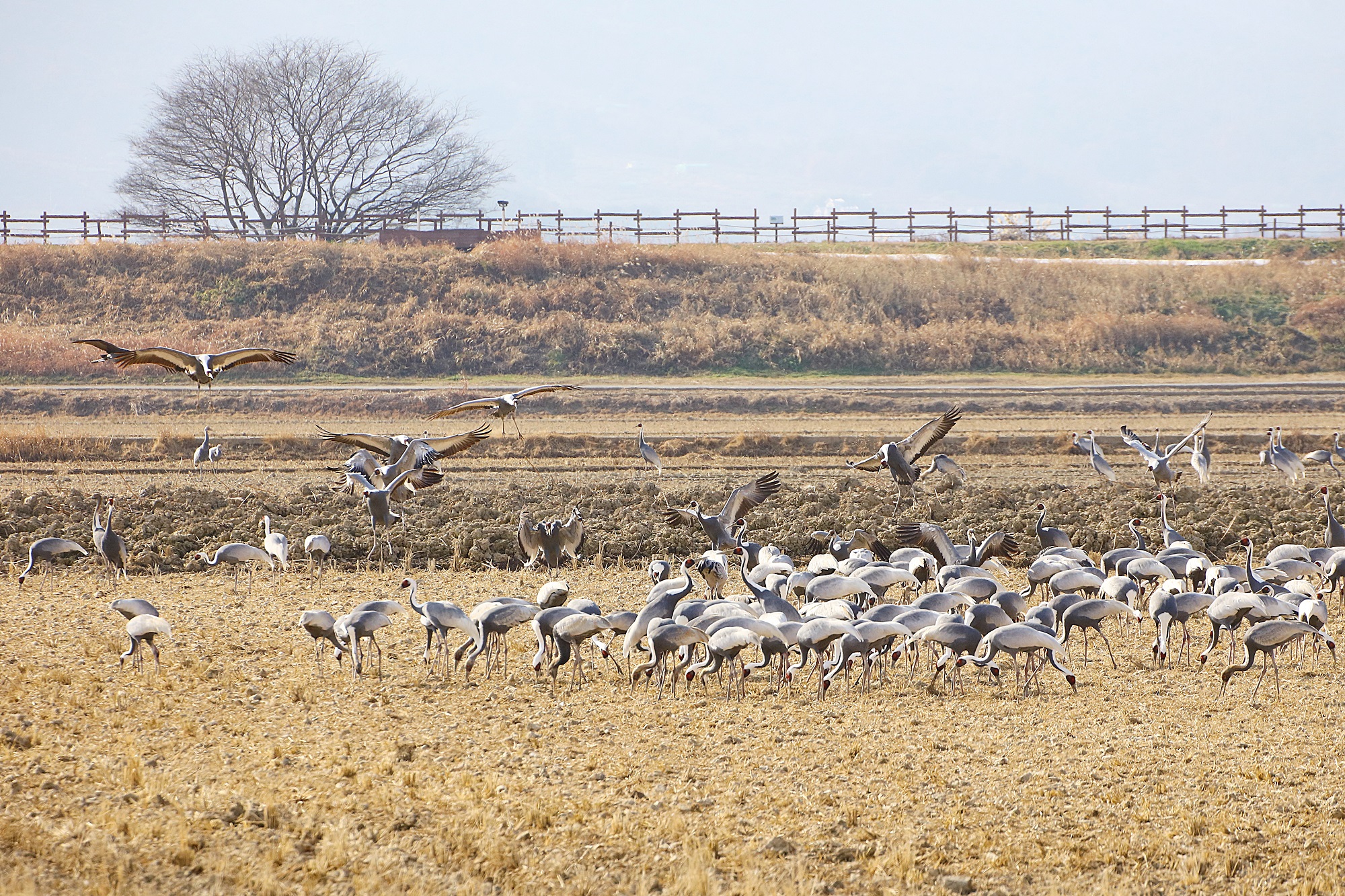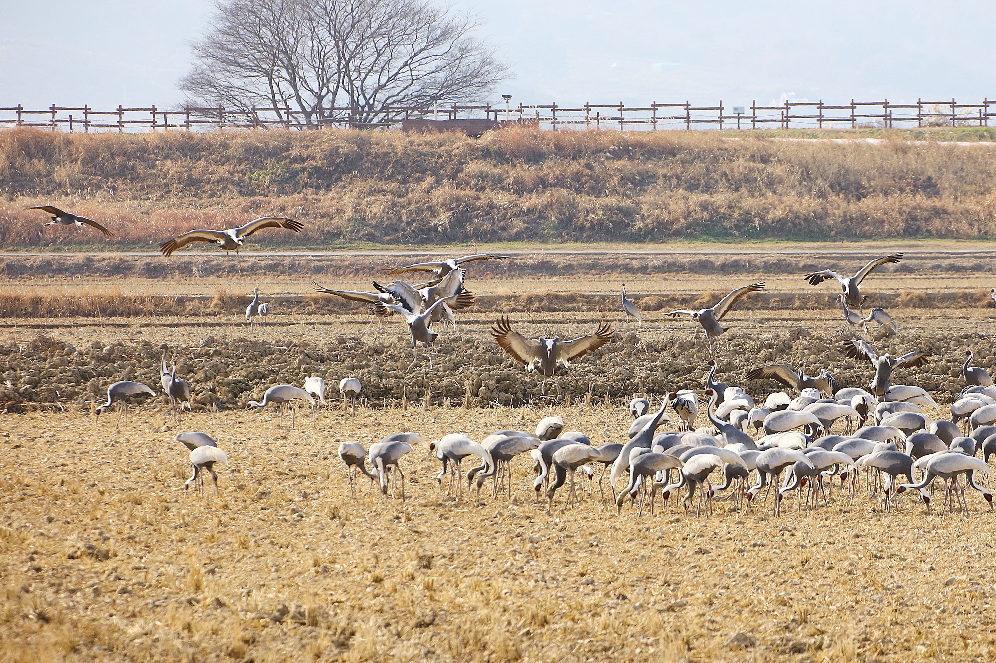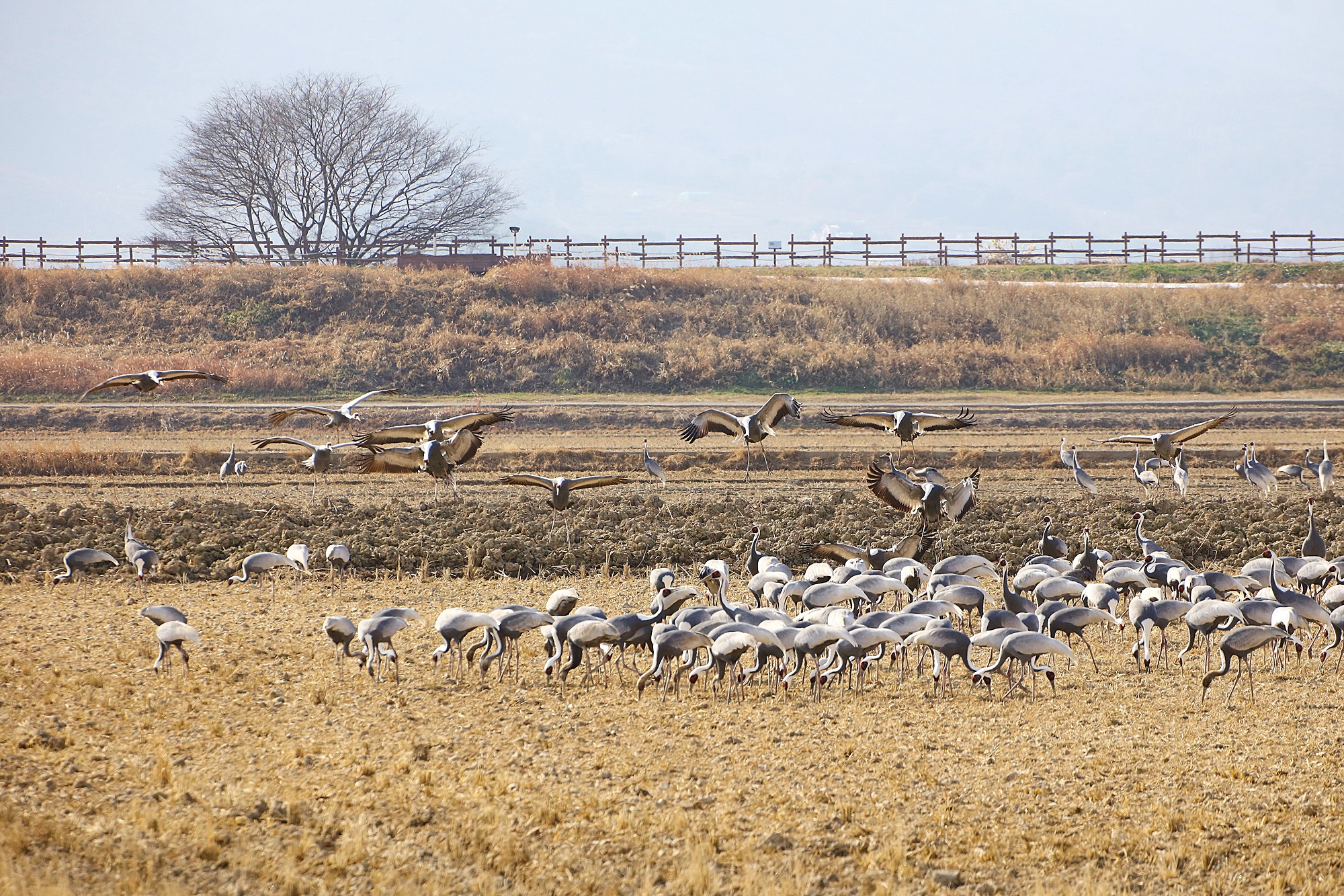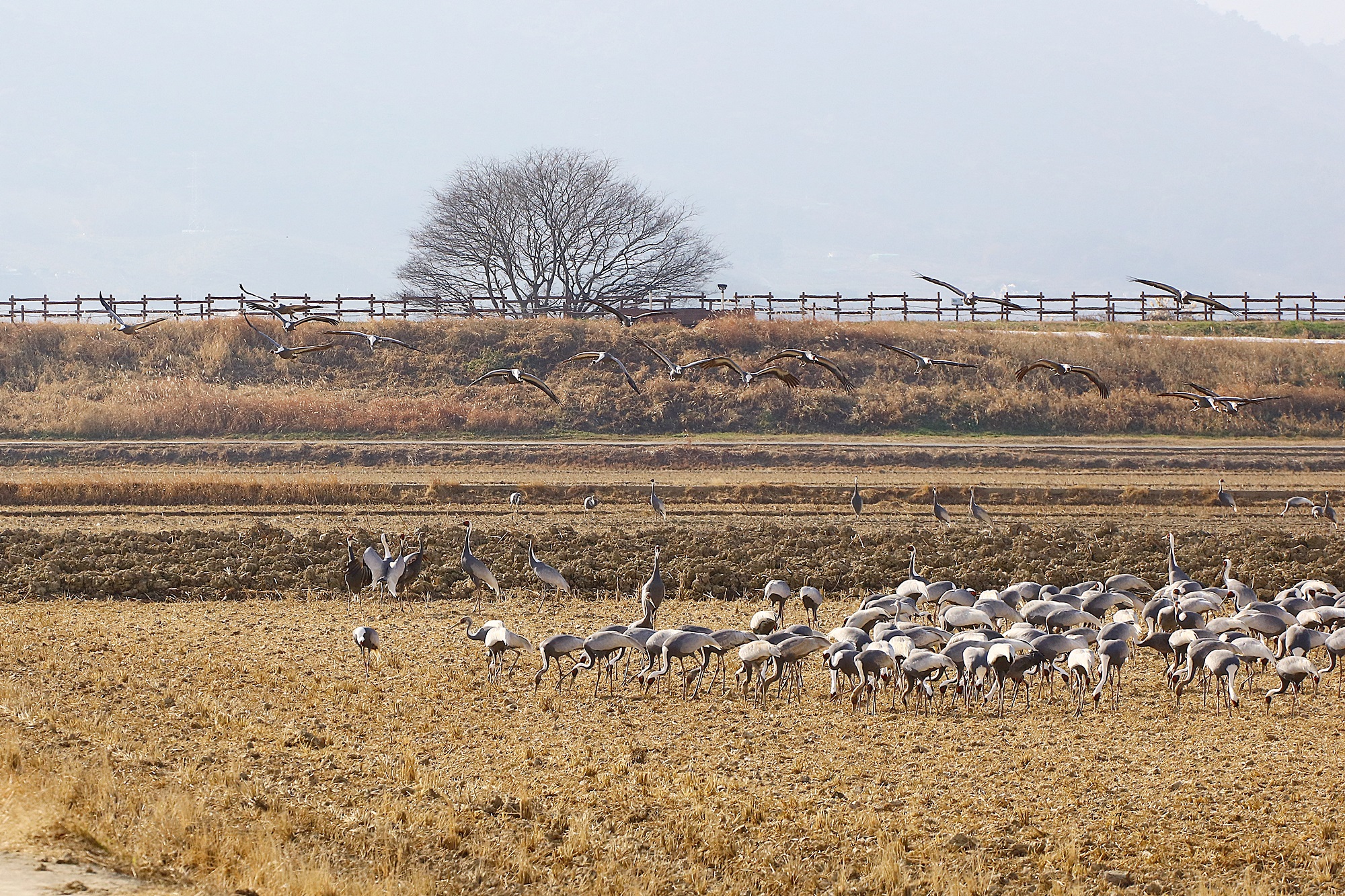 창원 주남지 들 위를 날던 재두루미가 주남들에 내려앉습니다.