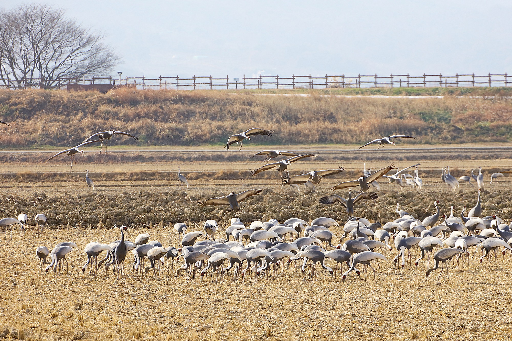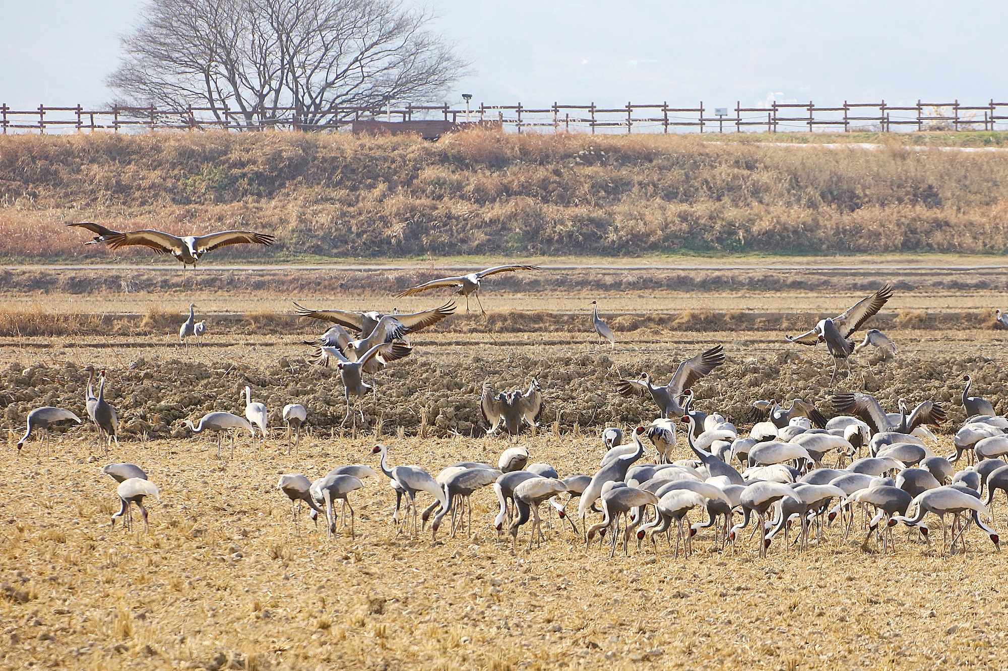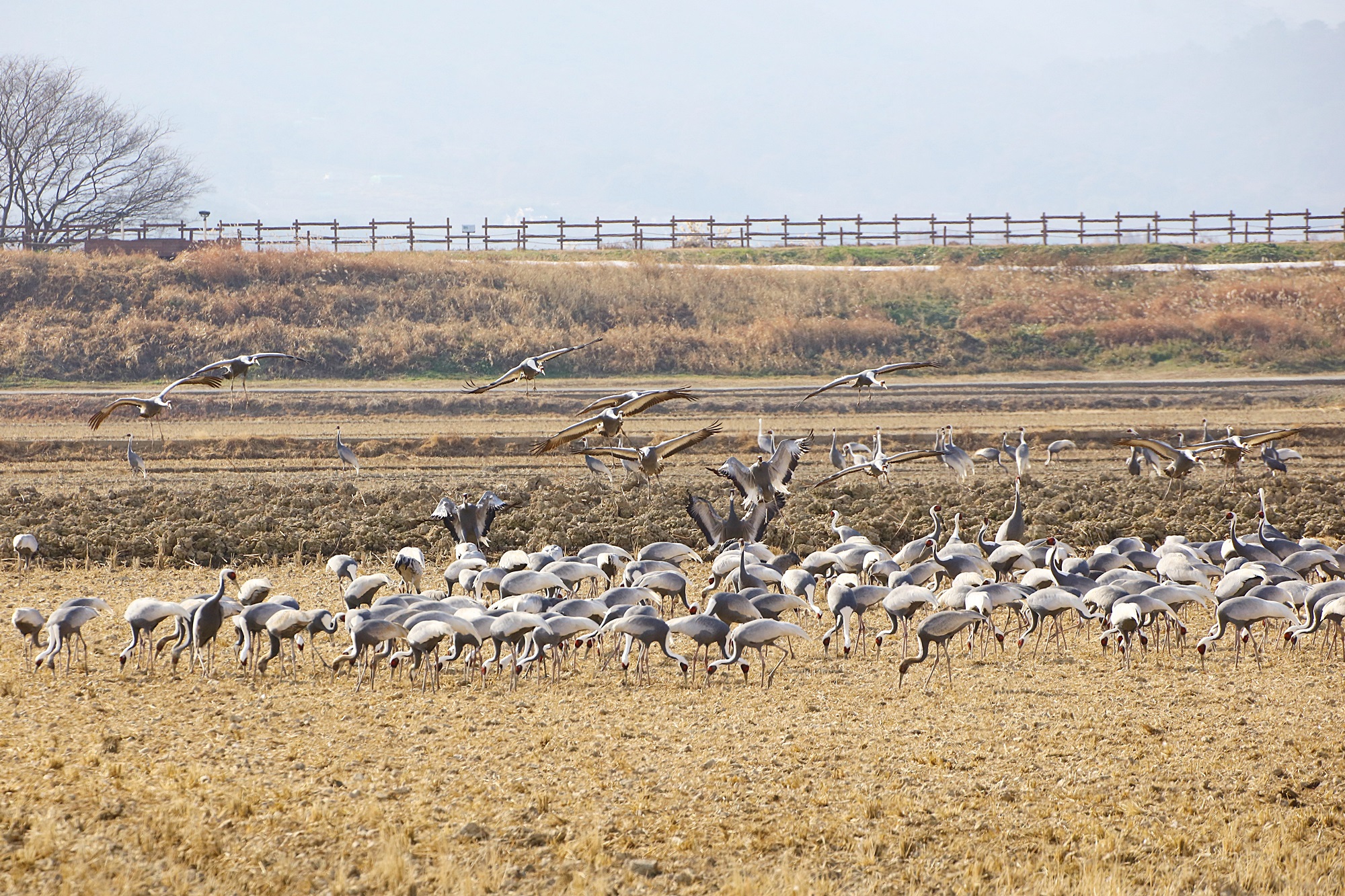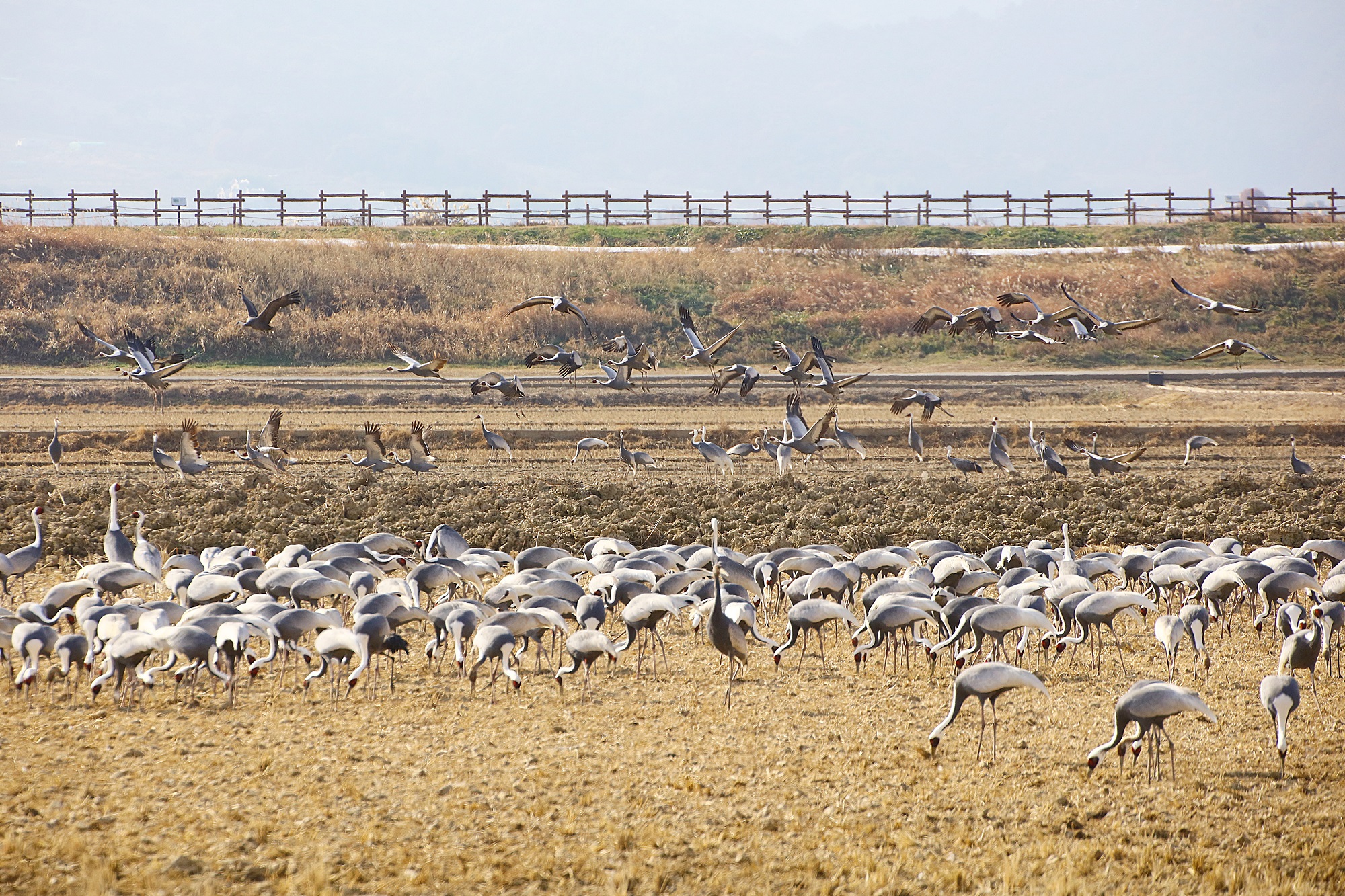 창원 주남지 들 위를 날던 재두루미가 주남들에 내려앉습니다.