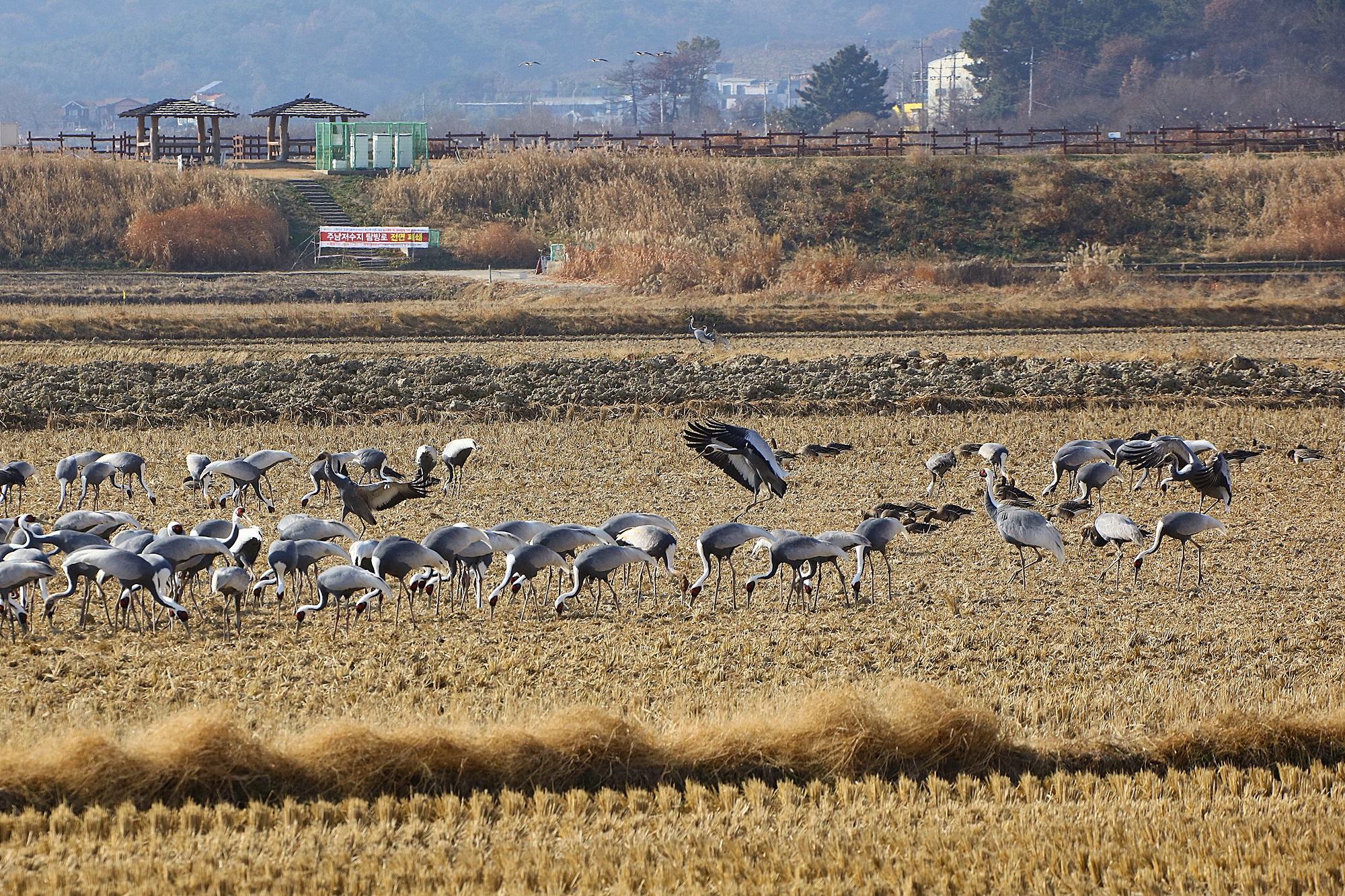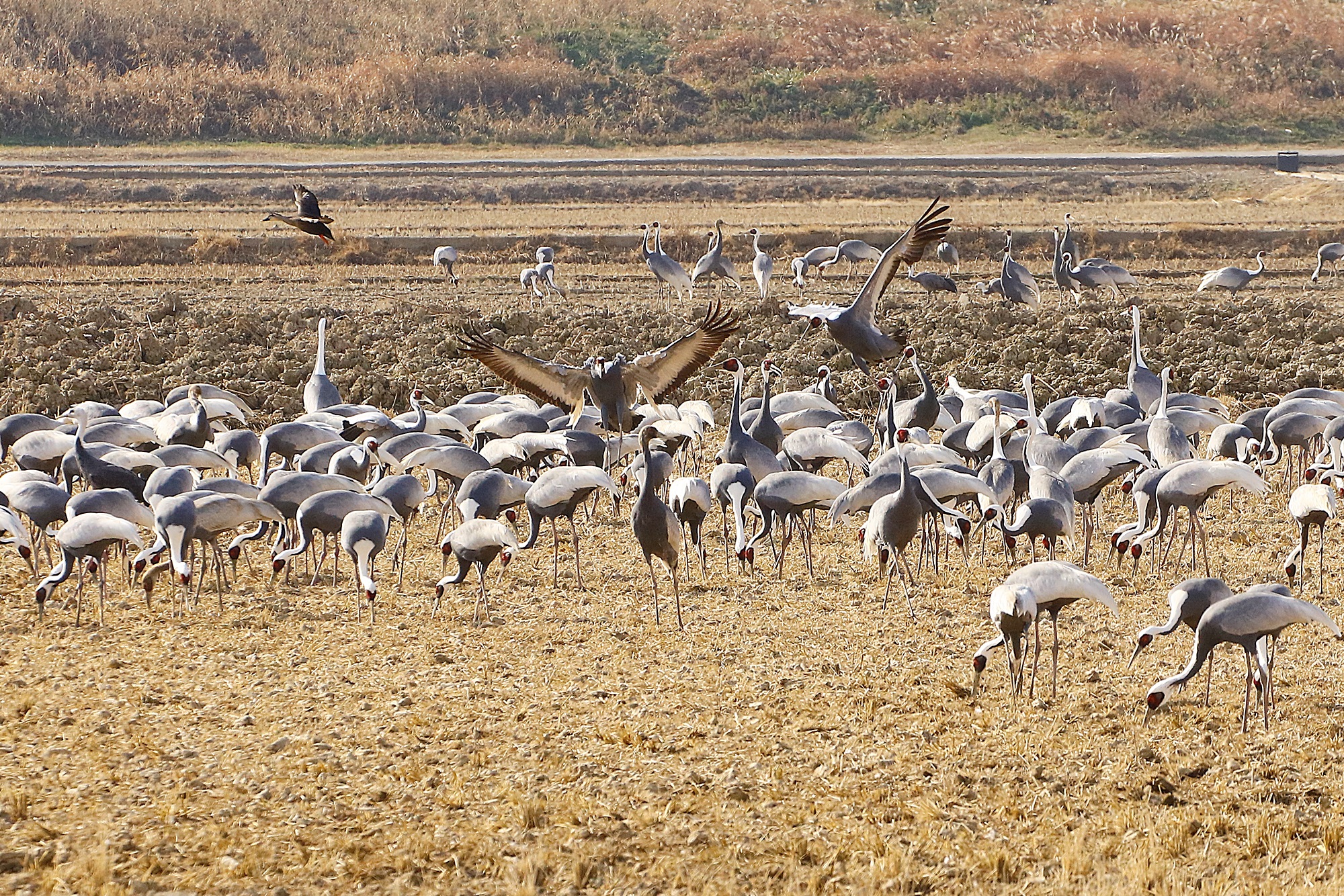 창원 주남지 들 위를 날던 재두루미가 주남들에 내려앉습니다.