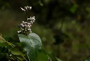 잎의 밑 부분은 심장 모양이고 끝 부분은 뾰족하며 윗면은 짙은 녹색이고 털이 있다.