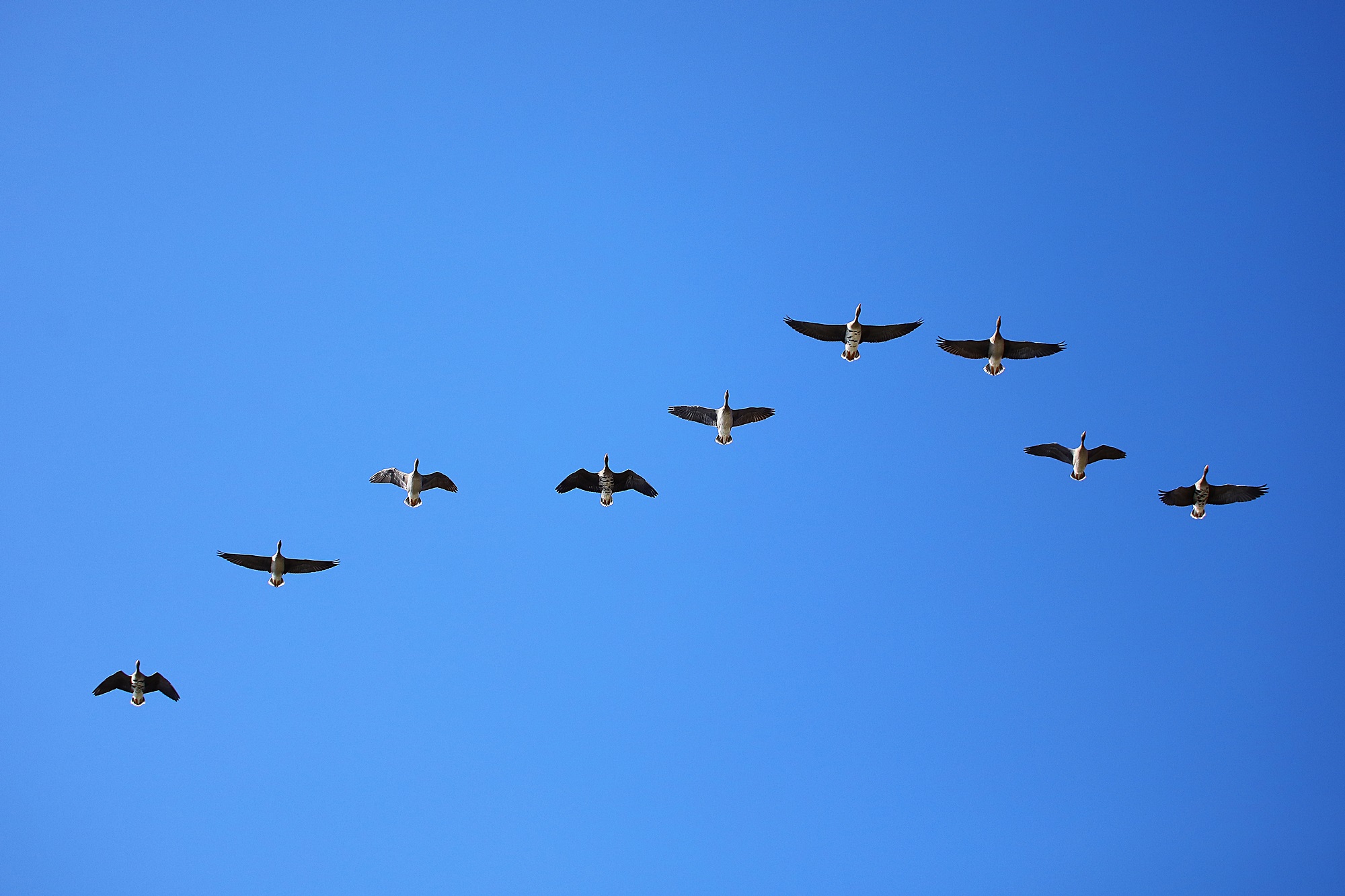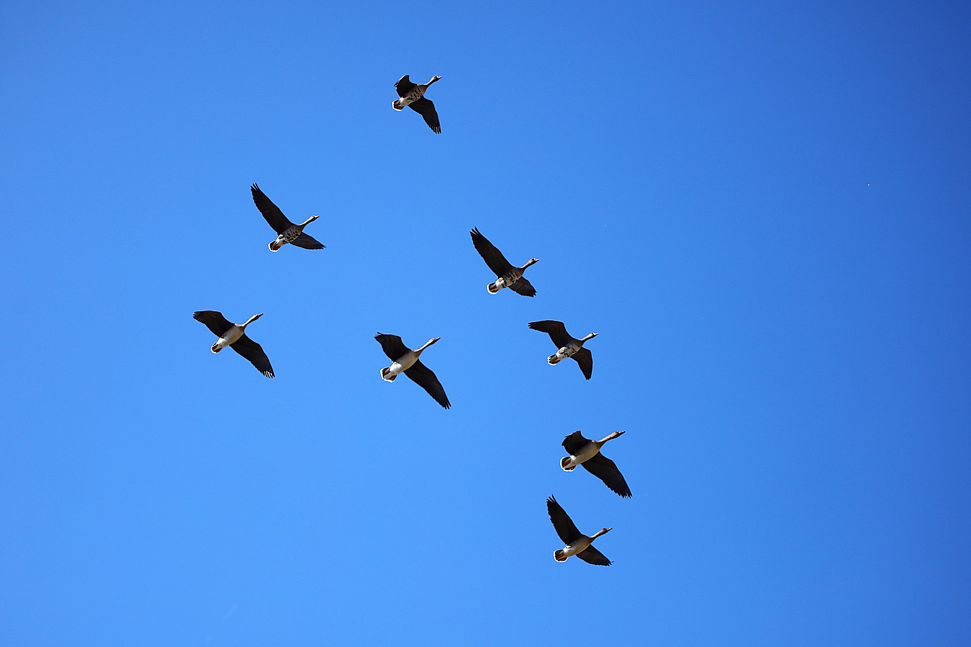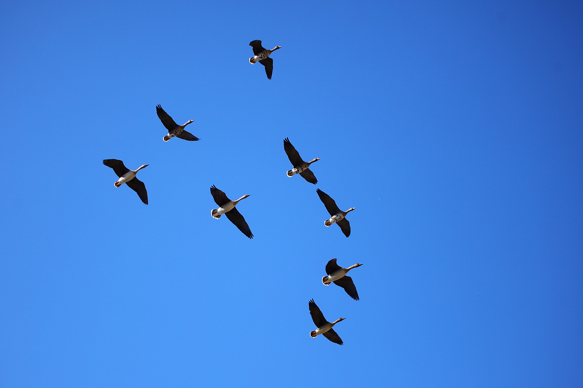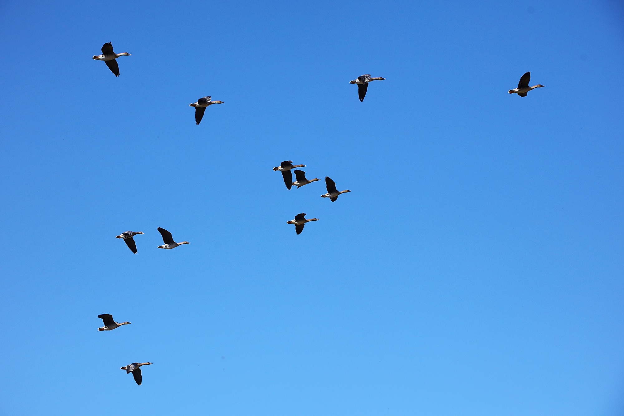 주남지의 하늘에 기러기들이 날고 있습니다.